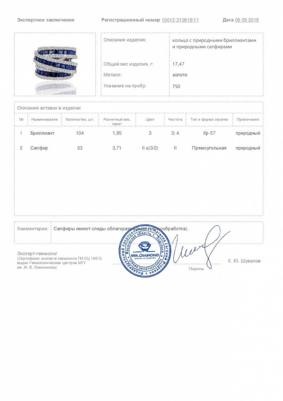 кольцо с бриллиантами 1.95ct, кольцо с сапфирами 3.71ct |