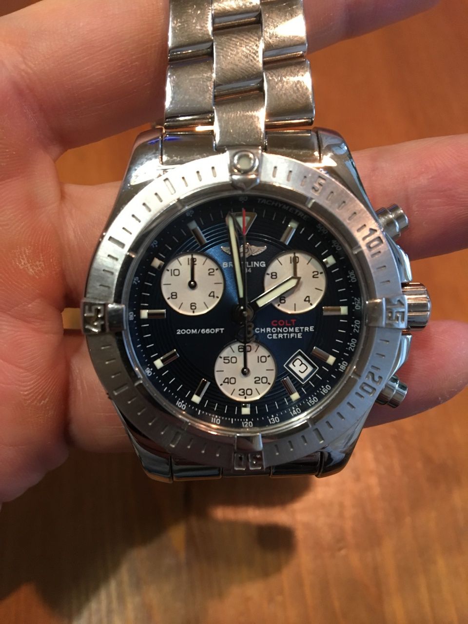 Выставляю на продажу идеальную, на мой взгляд, синелицую модель Кольта. Максимум плюшек при адекватном прайсе. Накладные метки, накладная ворона, стрелки хронографа с шильдиками на попках, косой браслет, термокварц - сейчас уже сам брайт предлагает гораздо более кастрированный вариант. Гонялся за ней около года, потом еще год пытался привыкнуть к 41 размеру - но, увы, не мое. Никаких нареканий нет, брал б/у у форумчанина, поэтому насчет года покупки и полировки не могу быть уверенным. Год назад в авторитетном сервисе была произведена замена батарейки с проверкой герметичности. Квитанцию предоставлю. Точность даже не буду обсуждать. В комплекте браслет на руку 18 см с доп звеном, оригинальный каучук и один раз надетый под костюм хирш с оригинальной брайтовской баклей. Фактически я собрал конструктор на все случаи жизни - я при покупке так полагал! Картонную коробку я продал, так как был уверен, что с ними не расстанусь, а кожаный кейс имеется, так что коробку я написал как отсутствующую. Пересылать не готов. К торгу не готов - разве что в один форумный шаг для округления. Покупка замены не привязана к продаже, так что искренне не тороплюсь, говорю как есть. Часы действительно замечательные, больше таких не делают.