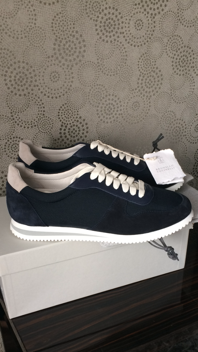 В продаже,новые мужские сникеры известной итальянской марки BRUNELLO CUCINELLI.Кроссовки изготовлены из натуральной замши тёмно-синего цвета с бархатистой текстурой,полуглянцевой телячьей кожи и текстурированного вафельного нейлона в виде сот.Вставки на пятке и язычке серо-бежевого тона перекликаются с оттенком клиновидной полосы на платформе.Внутри изделие отделано перфорированной натуральной кожей,что обеспечивает комфорт.Обувь очень удобная и лёгкая благодаря материалам союзки и подошве из Micro.Белоснежные шнурки завершают образ.