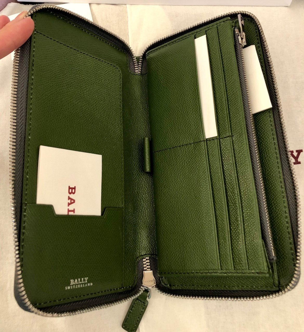 Превосходная плотная кожа выделки Saffiano, цвет оливково (зеленый). Размеры как у хорошего органайзера - 11 см на 21 см, толщина 2 см. Внутри организовано превосходно: 4 больших продольных отделения, одно большое на молнии, откидной карман для паспорта и крупных документов типа ПТС, 12 отделений для кредиток, кожаная петля для ручки, низкий кармашек для важной карты или прав, легко помещается iPhone 8+. Все отделения внутри отделаны черной кожей и тканью.