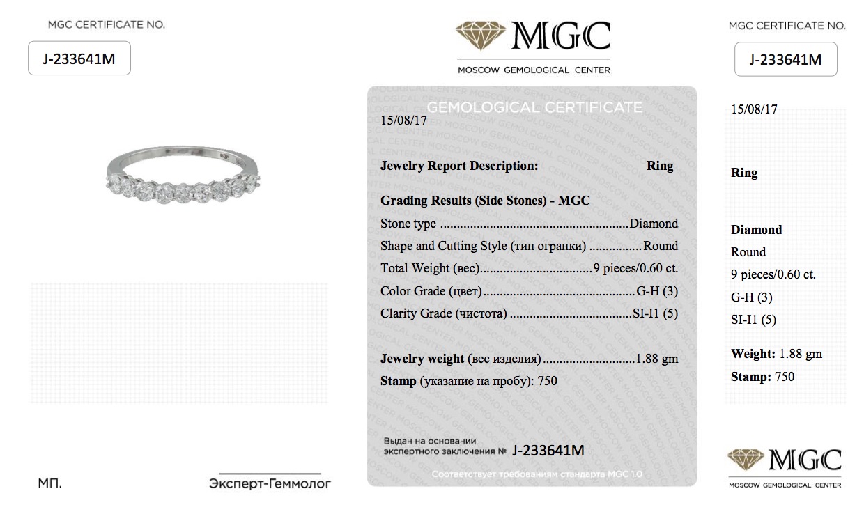 Обручальное кольцо из белого золота с бриллиантами 0,6 карат (сертификат МГЦ)