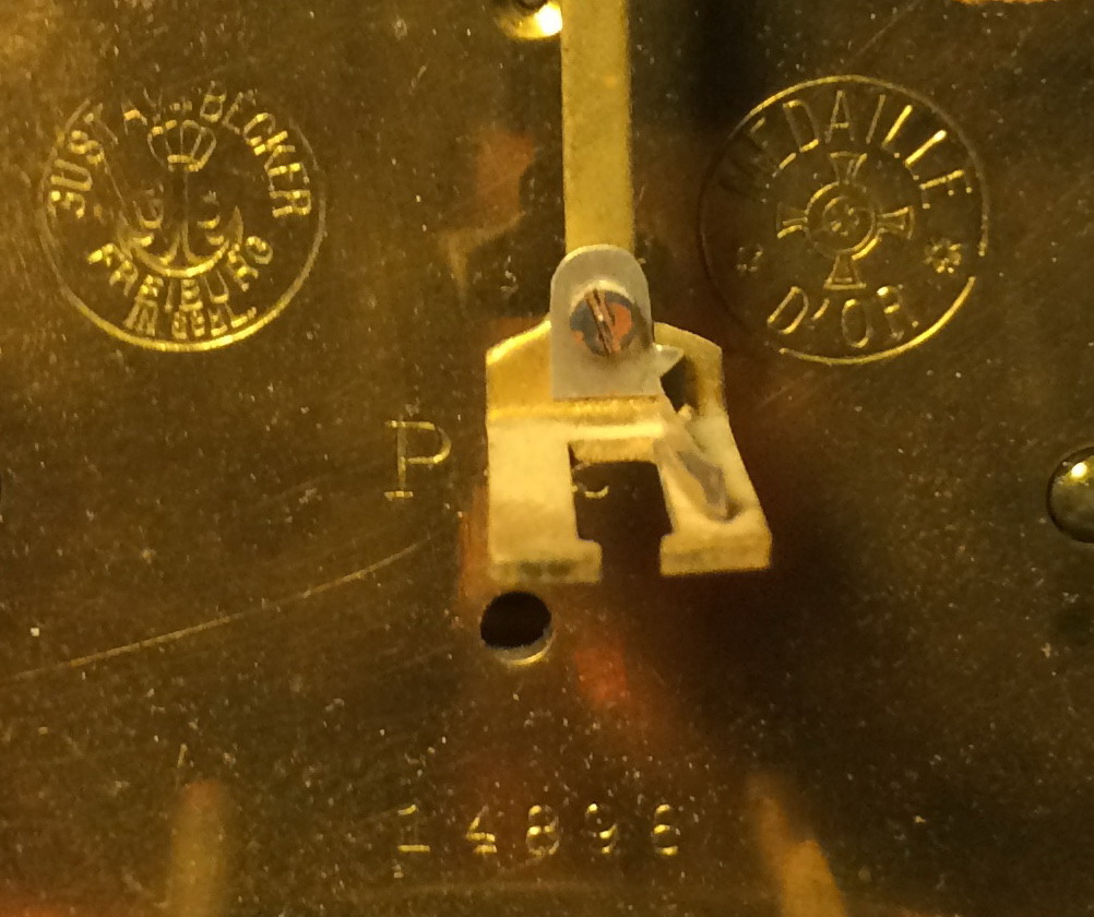 Стремя анкерной скобы оказалось оснащено отдельной двойной пружиной, которая, по моему разумению, скрадывает звук хода часов. Она представляет из себя зажим, между плеч которого мягко удерживается качалка маятника.