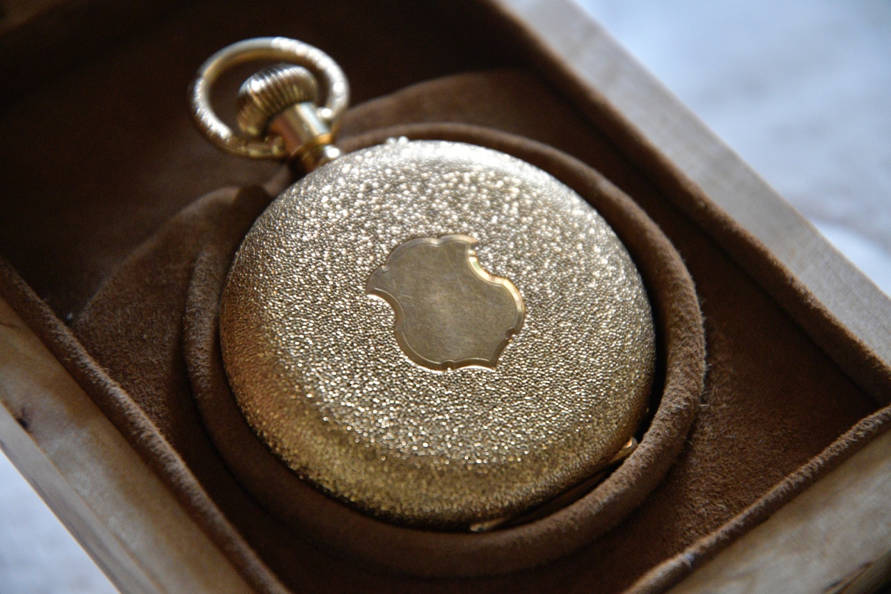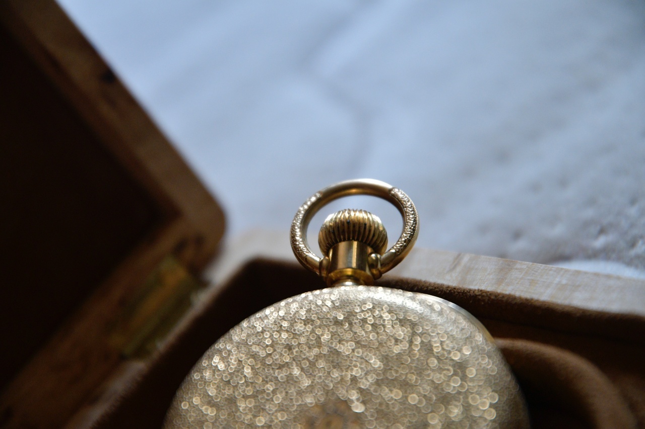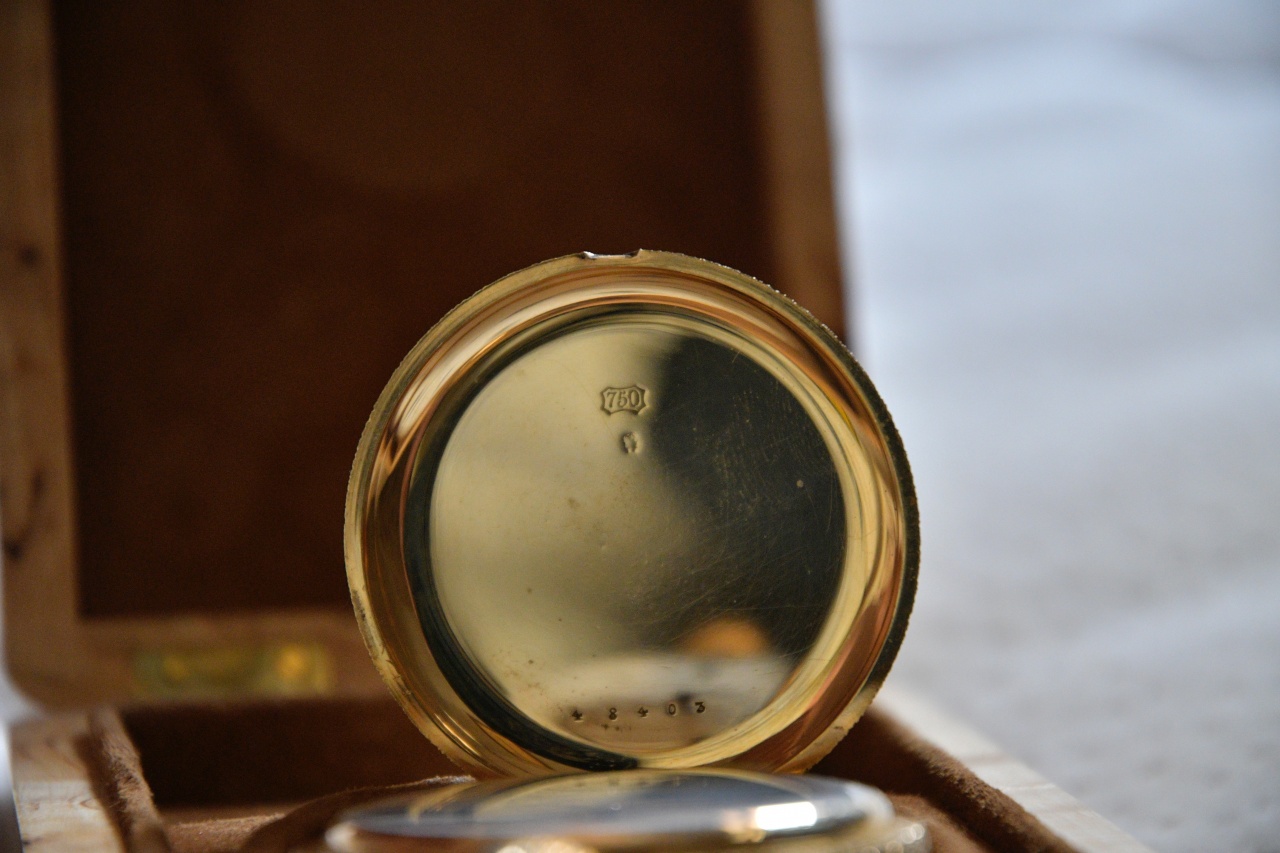 Корпус 3-крышечный из 72-каратного розового золота (проба 0.750). Часы закрытого типа, передняя крышка откидывается при нажатии кнопки на головке. На крышках узоры - каракуль, шильдик для инициалов не заполнен. Внутренняя крышка из золота, подписана Hy Moser & Cie с номером.
