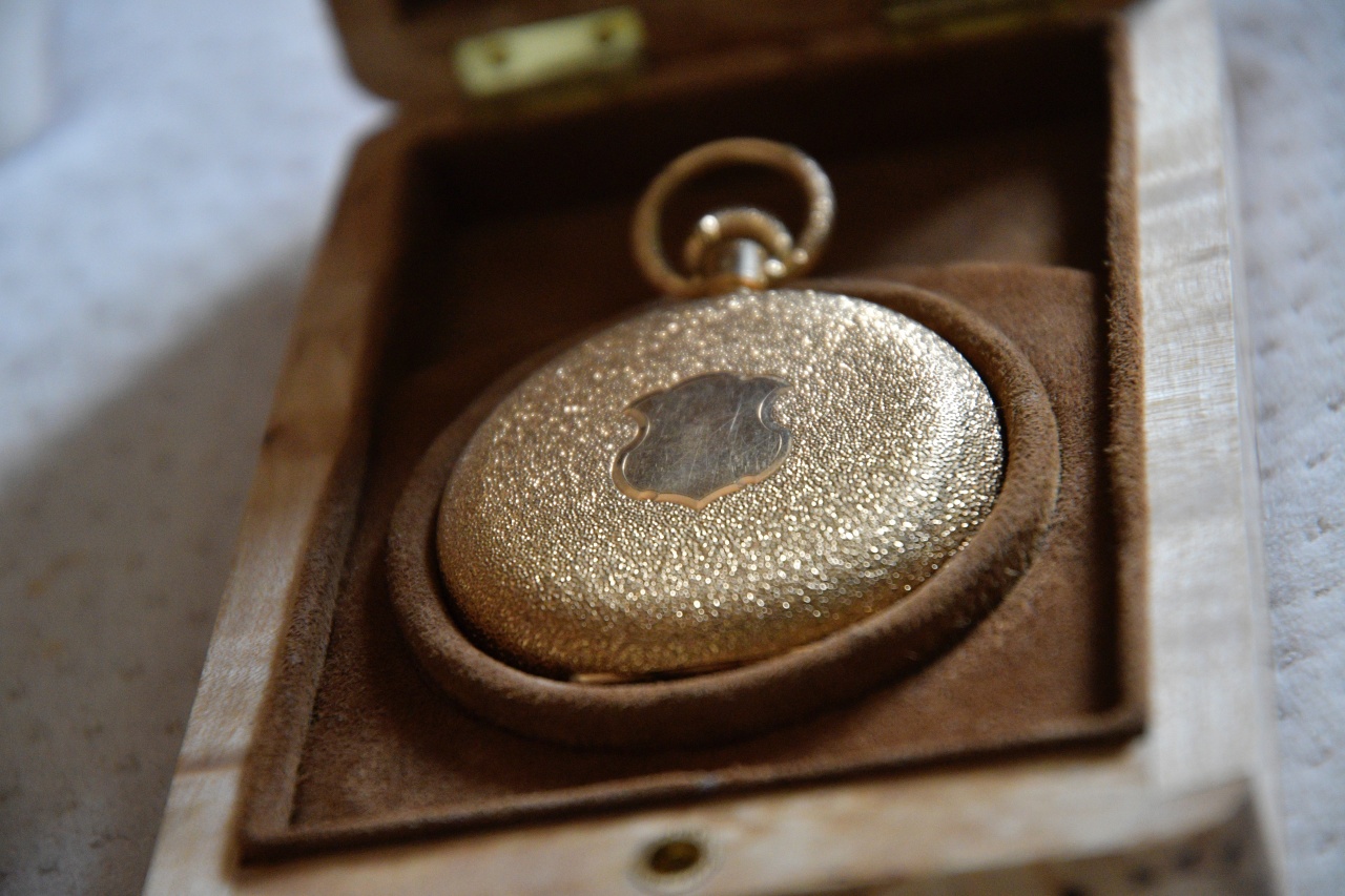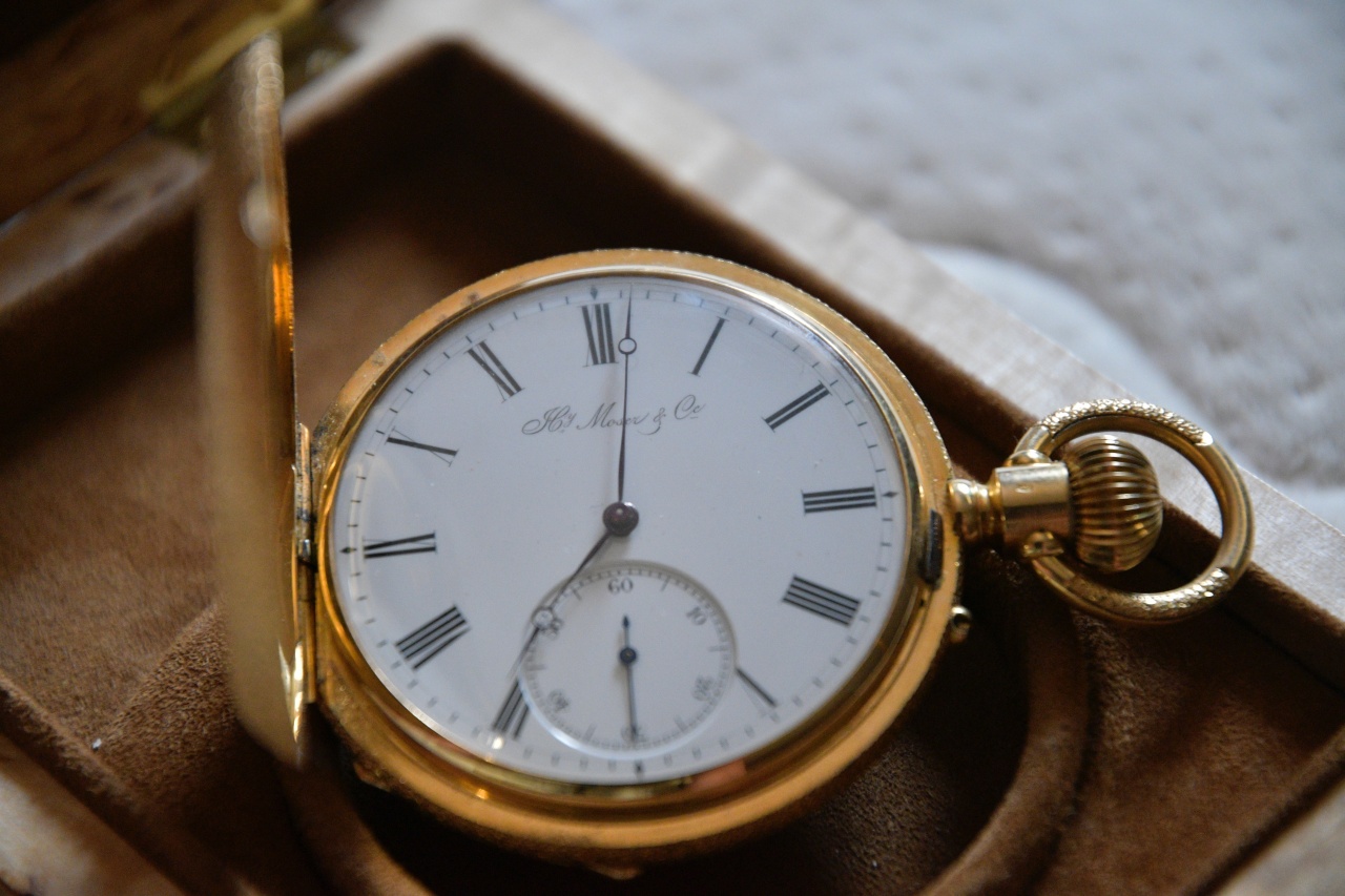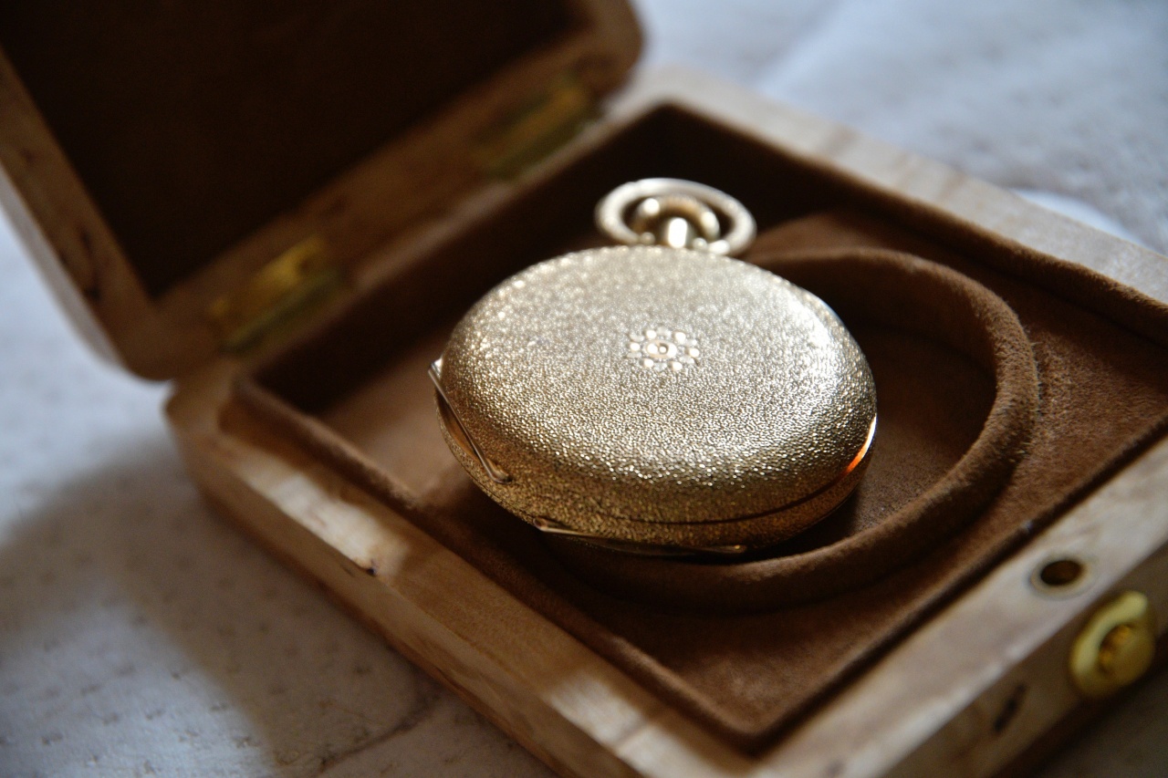 Корпус 3-крышечный из 72-каратного розового золота (проба 0.750). Часы закрытого типа, передняя крышка откидывается при нажатии кнопки на головке. На крышках узоры - каракуль, шильдик для инициалов не заполнен. Внутренняя крышка из золота, подписана Hy Moser & Cie с номером.