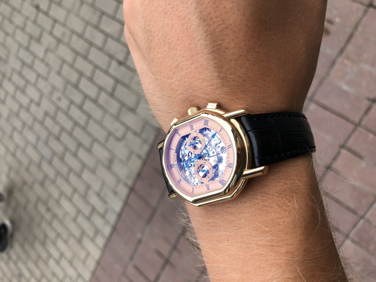 Очень приковывает внимание работа хронографа из за скелетона! Приятно сидят на руке , очень удачный размер под костюм!