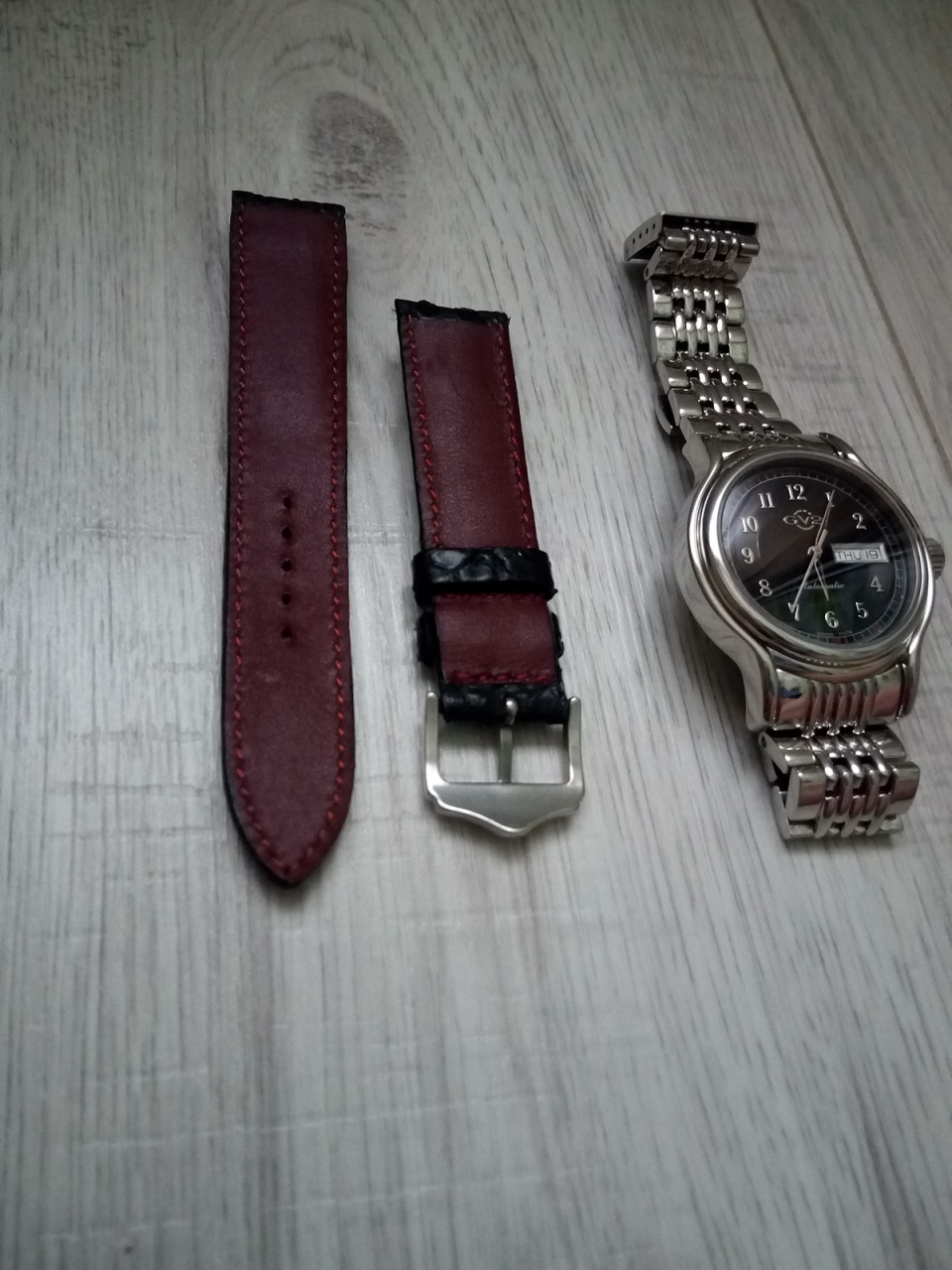 Браслет просто шикарный с красивой двойной застежкой, но короткий, на мою руку 17,5 сидят как родные, но если больше, то увы, доп. звеньев нет. В качестве компенсации этого момента в комплекте новый черный кожаный ремень на 20мм из питона (на фото).