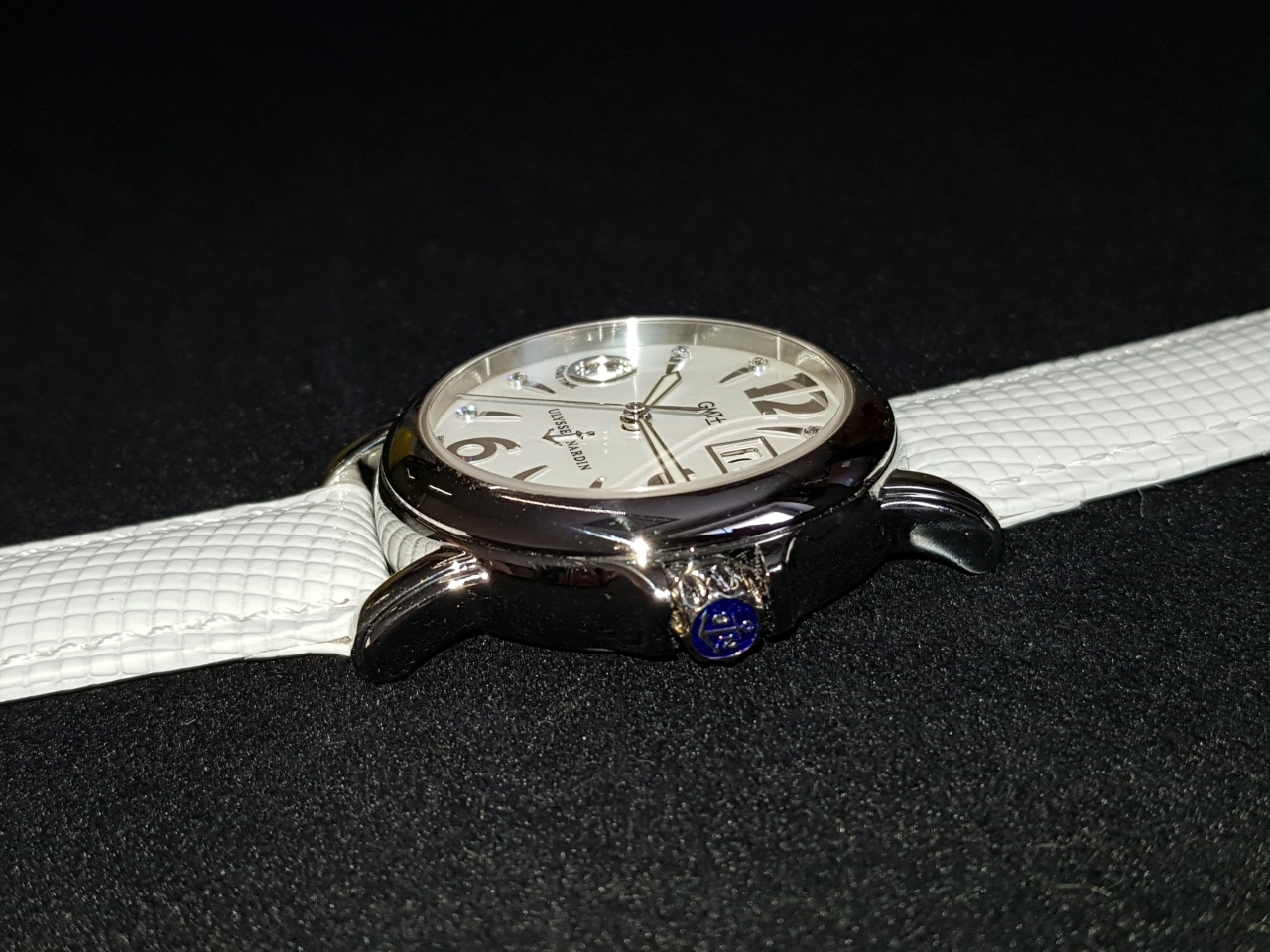 Циферблат: Белый перламутровый инкрустирован 7 белыми бриллиантами.