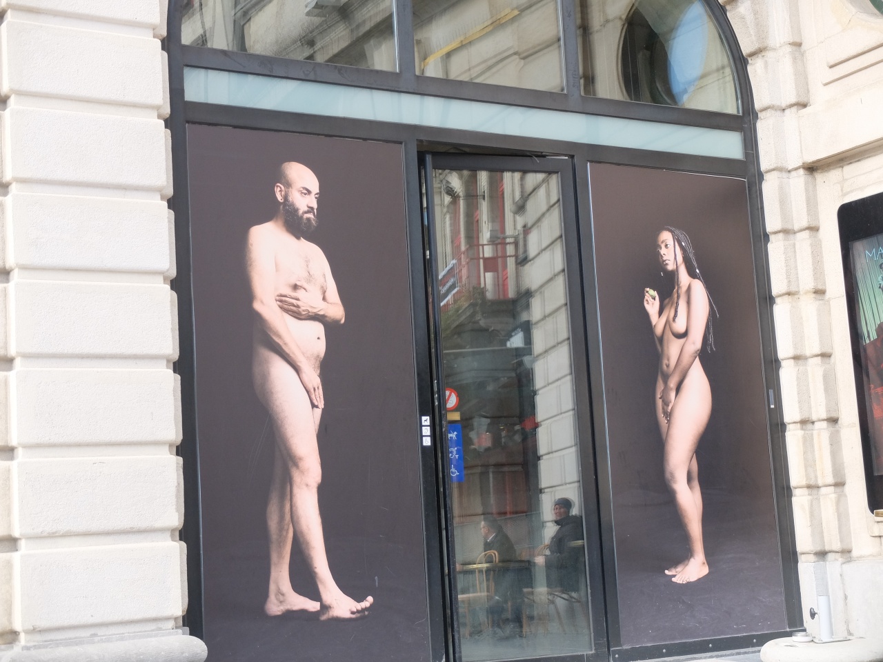 Ну и по соседству с собором сбежавшая пара - Адам (причем как и должно быть - с явными иудейскими признаками) и Ева (с африканскими. А и правда, афро-жители Земли ведь от кого-то произошли?).