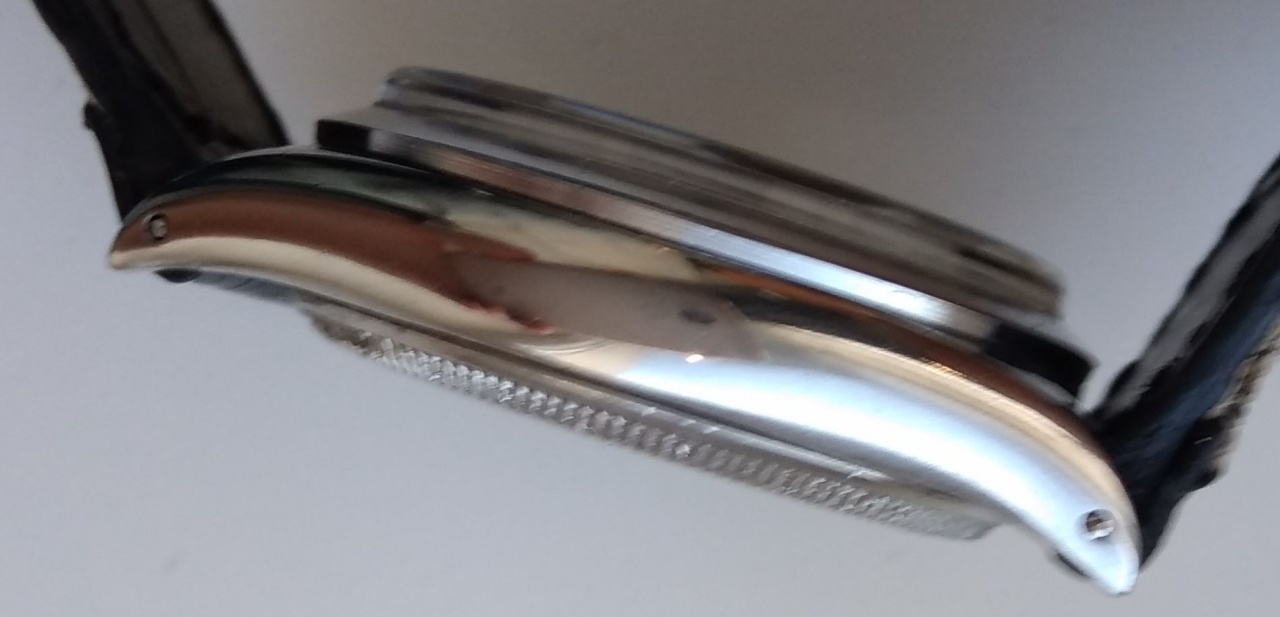На циферблате присутствует патина (убирать не стал). Так как часы родом из СССР, а у наших мастеров ключа не было, то когда-то их открыли просверлив две дырки в крышке (на сегодняшний день они запаяны). На самой крышке присутствует надпись REGISTRED DESIGN MODELE DEPOSE (что является редкостью - в основном эта надпись не доживает до наших дней - она становится жертвой полировки). На корпусе номер за ремешком номер - 958***