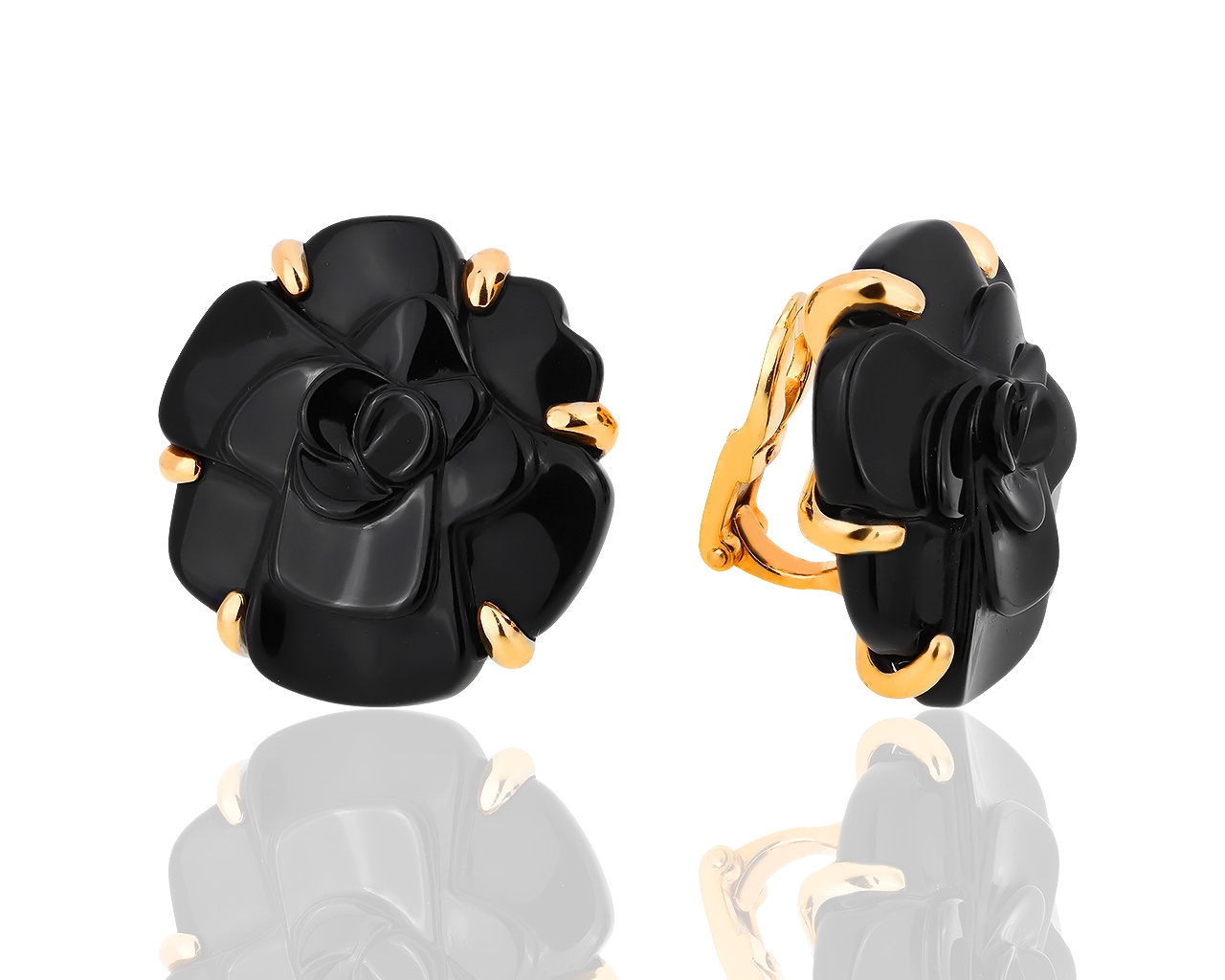 Элегантные золотые серьги с ониксом Chanel Camellia