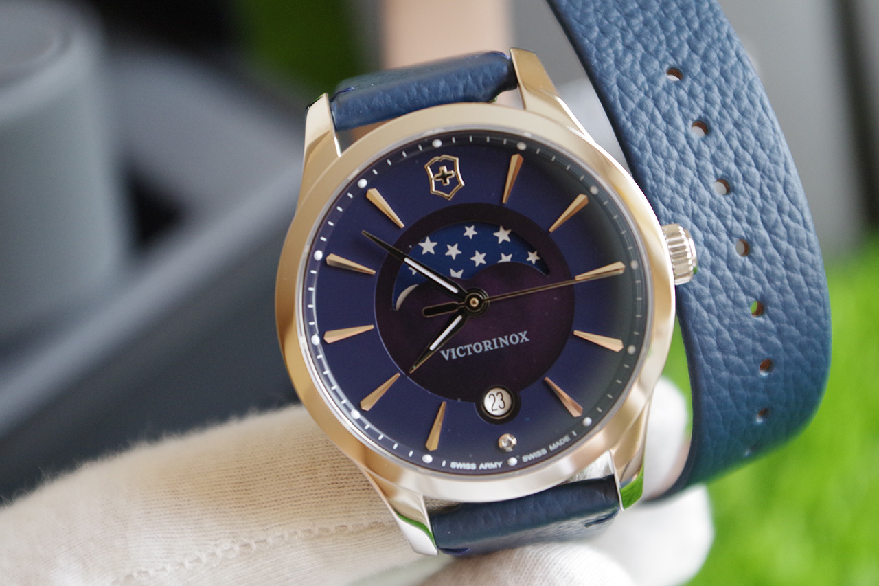 Alliance Small. Часы на длинном ремешке. Функция индикации заряда (EOL). Накладные индексы. Завинчивающаяся задняя крышка украшена выгравированным изображением Луны.
