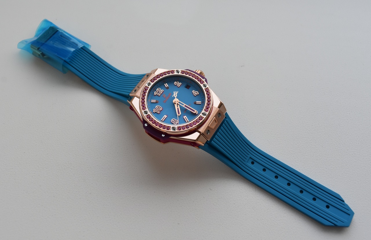 Ремешок: синий фактурный каучук, дополнительный ремешок из фиолетового каучука и розовой кожи, ремешок из розового каучука и розовой и фиолетовой кожи аллигатора, браслетная застежка из золота King 18K и титана с покрытием из золота.