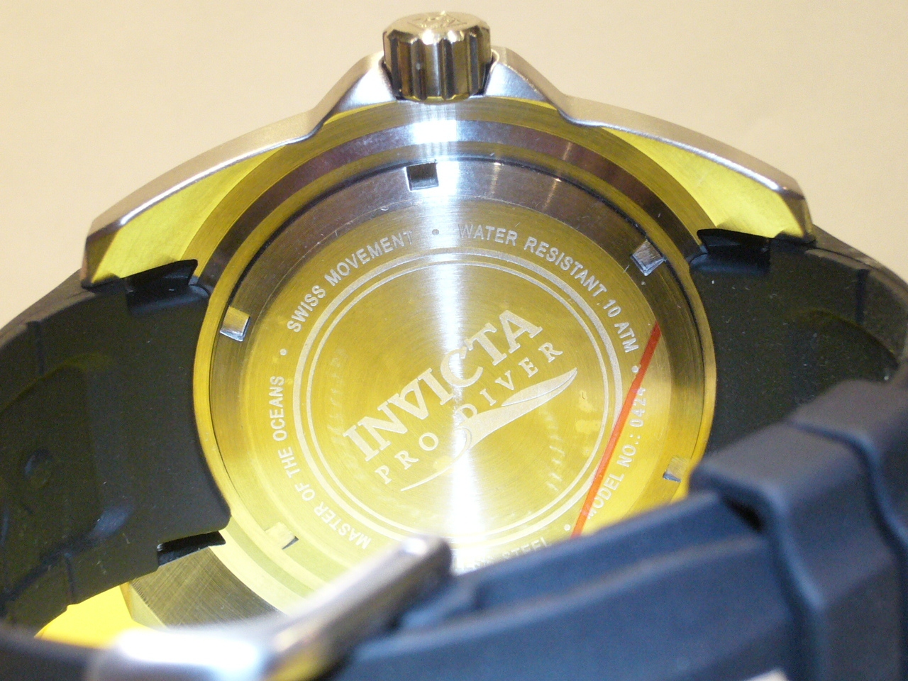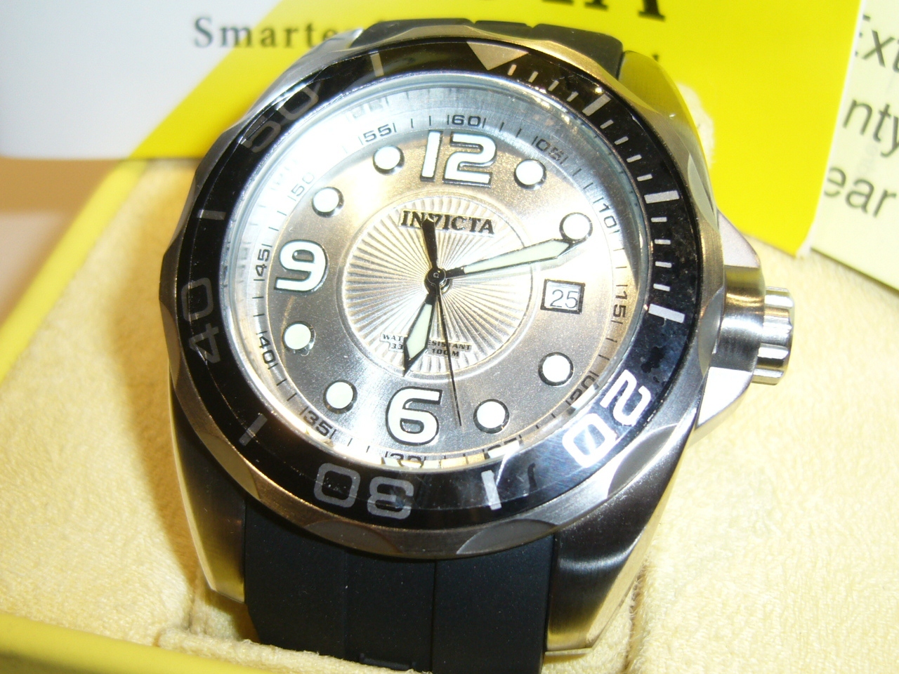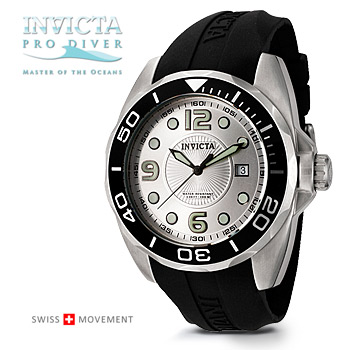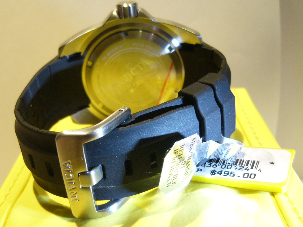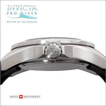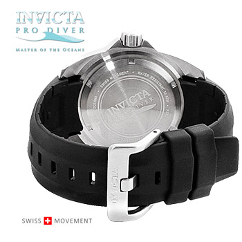 Ремешок - черный, из мягкого полиуретана с каучуком с двойной рельефной надписью Invicta - 22мм (0,87 ") в ширину, 24,5см (91/4") в длину, с пряжкой из нержавеющей стали с выдавленной надписью Invicta.
