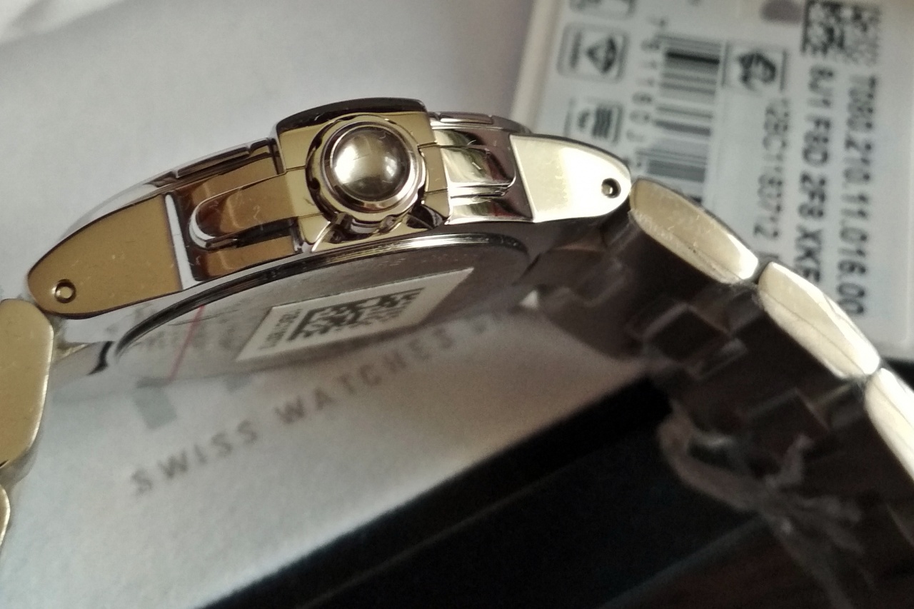 Корпус этих часов выполнен из нержавеющей стали L316 размером (31,5 мм). Модель имеет устойчивое к царапинам сапфировое стекло, браслет из нержавеющей стали металлического цвета с застёжкой бабочкой, белый циферблат. Циферблат украшен 9ю бриллиантами. Калибр механизма: ETA F04.111. Класс водозащиты: 50 м / 5 АТМ. Дополнительные функции и особенности: отображение числа, EOL-(система, уведомляющая владельца о том, что необходимо заменить элемент питания).