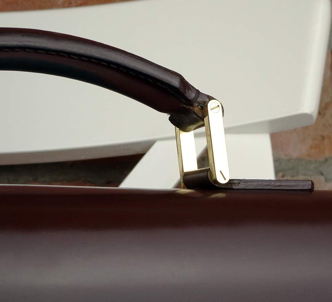 Фото ручки портфеля. Снизу на ручке небольшой надрыв кожи. Можно носить и так, при желании можно отнести в ремонт где осуществляют работы по коже, и укрепить место разрыва прошивкой или заклепкой. Ручка в целом в отличном состоянии - заливной шов не растрескался, кожа не затерта.