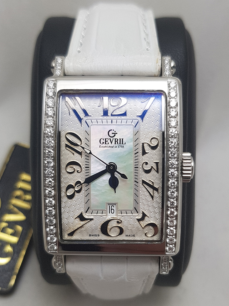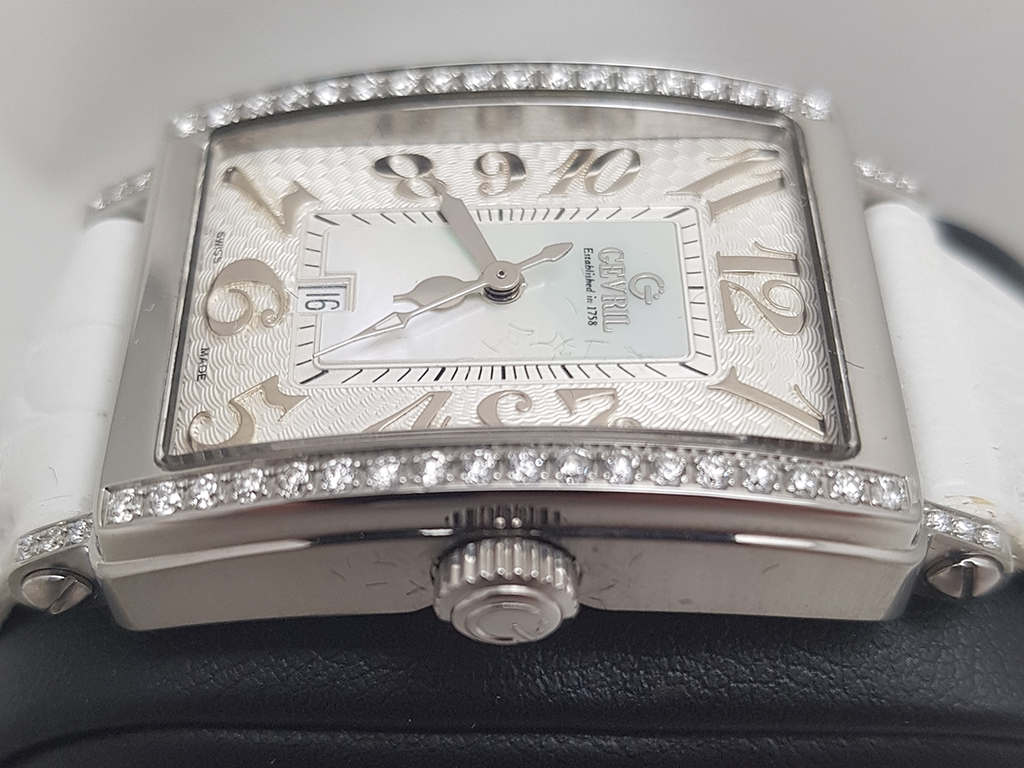 - Гильошированный серебряный циферблат с перламутровой вставкой