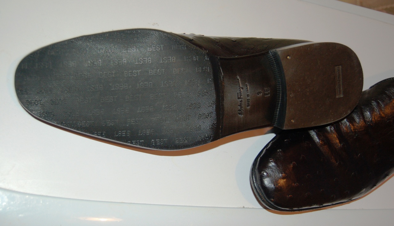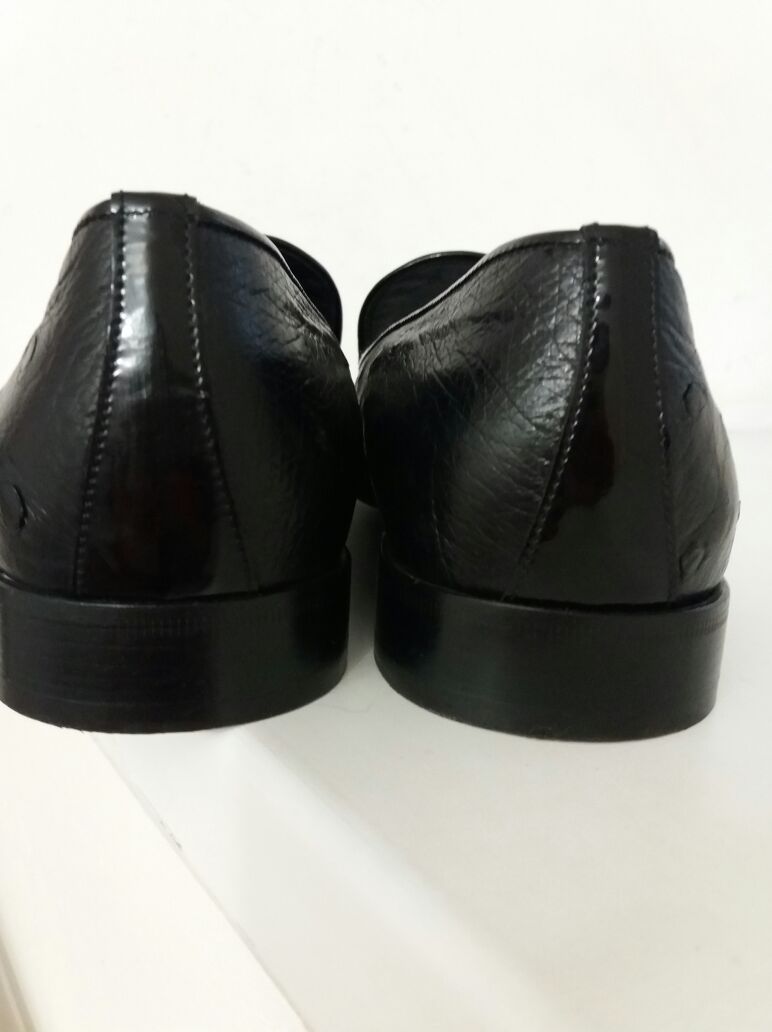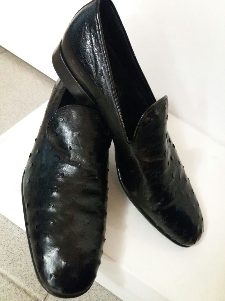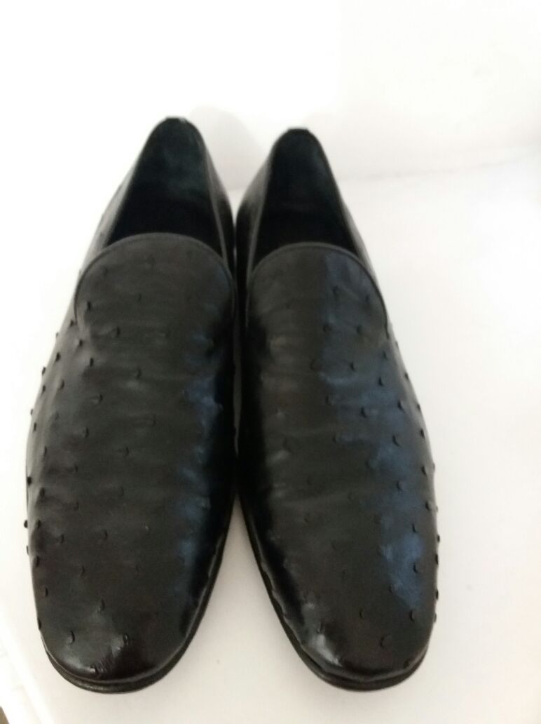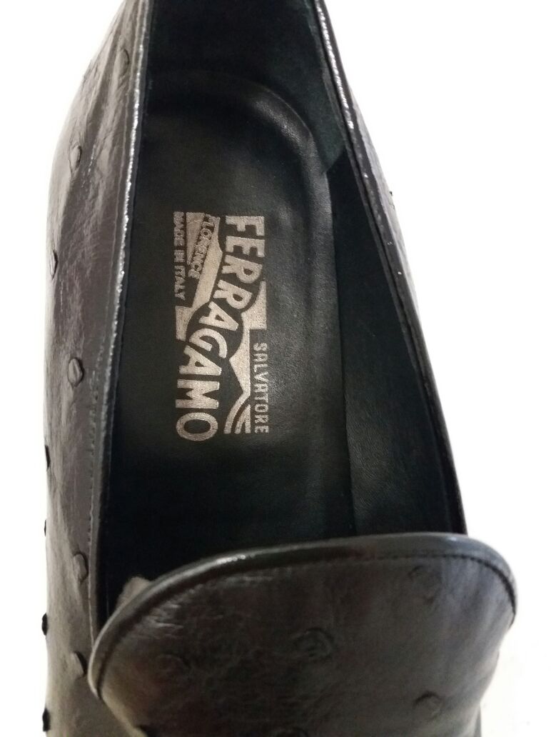Продам мужские черные лоферы (туфли без шнурков) Salvatore Ferragamo из кожи страуса. Размер 9 EE (широкие). Соответствуют нашим 42 - 42,5 размерам (стелька – 28,5 см). Италия, ручная работа. Верх – кожа страуса специальной выделки (Full Genuine Ostrich Quill), подошва и стелька – кожа. На подошве – профилактика.