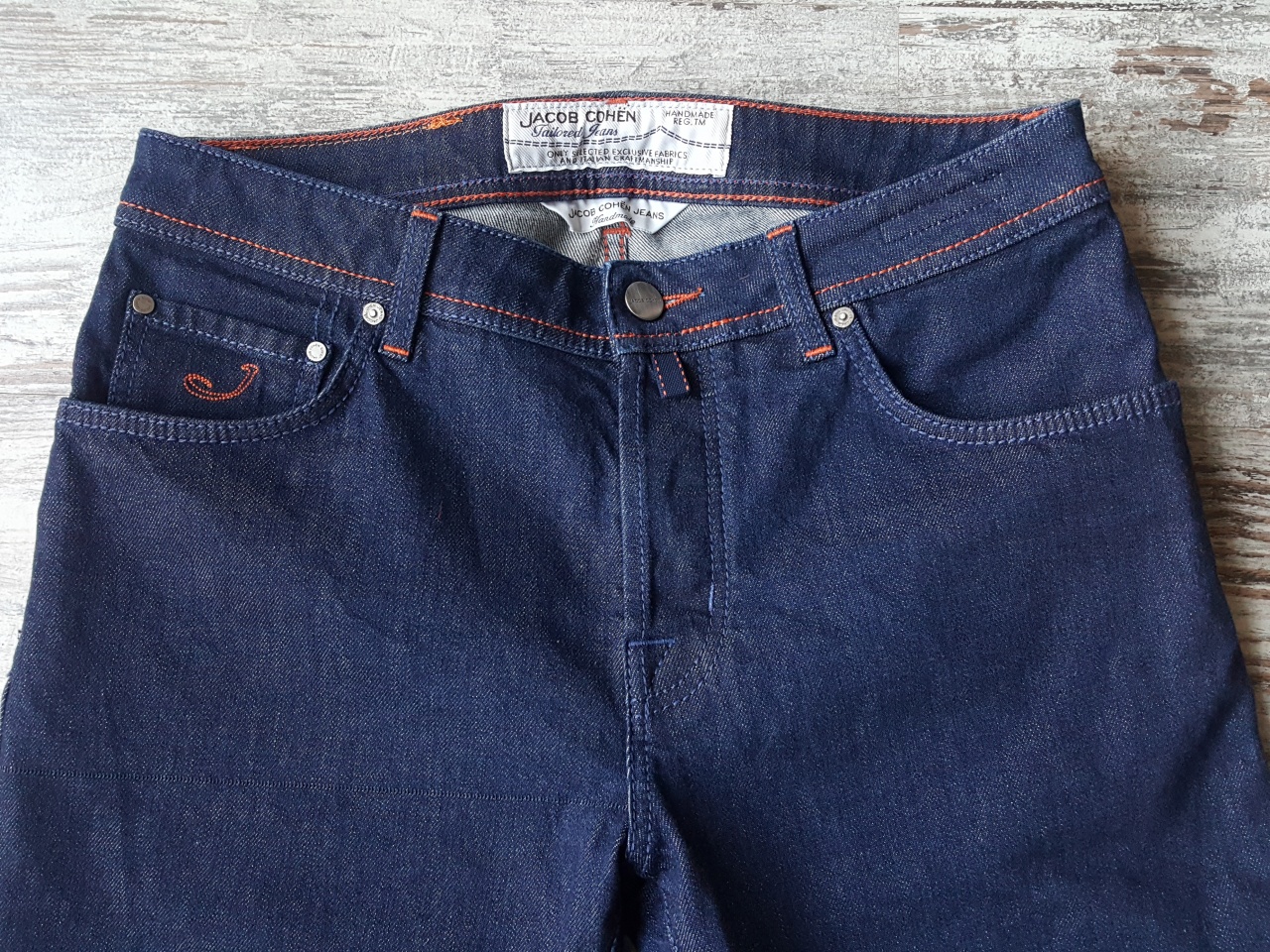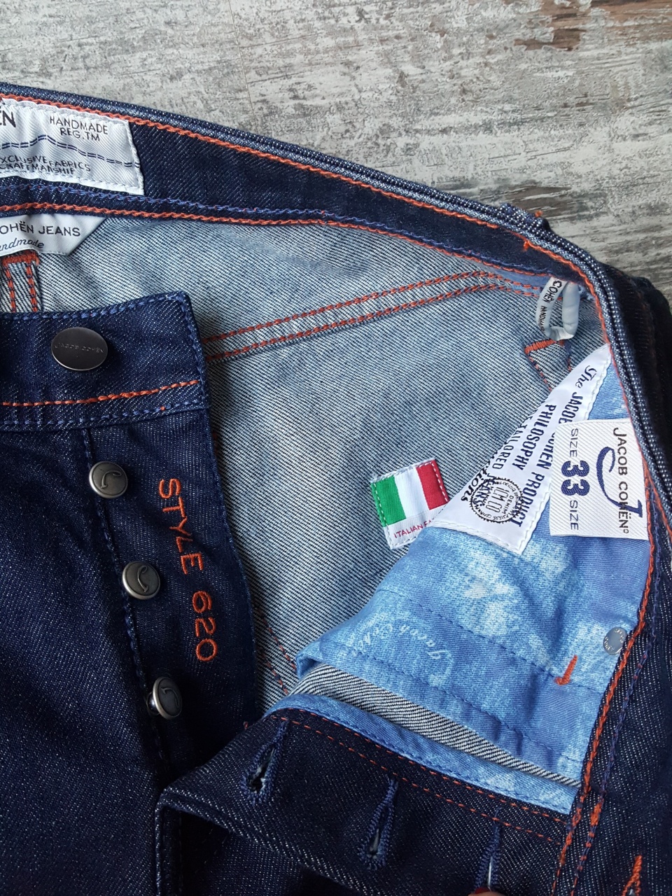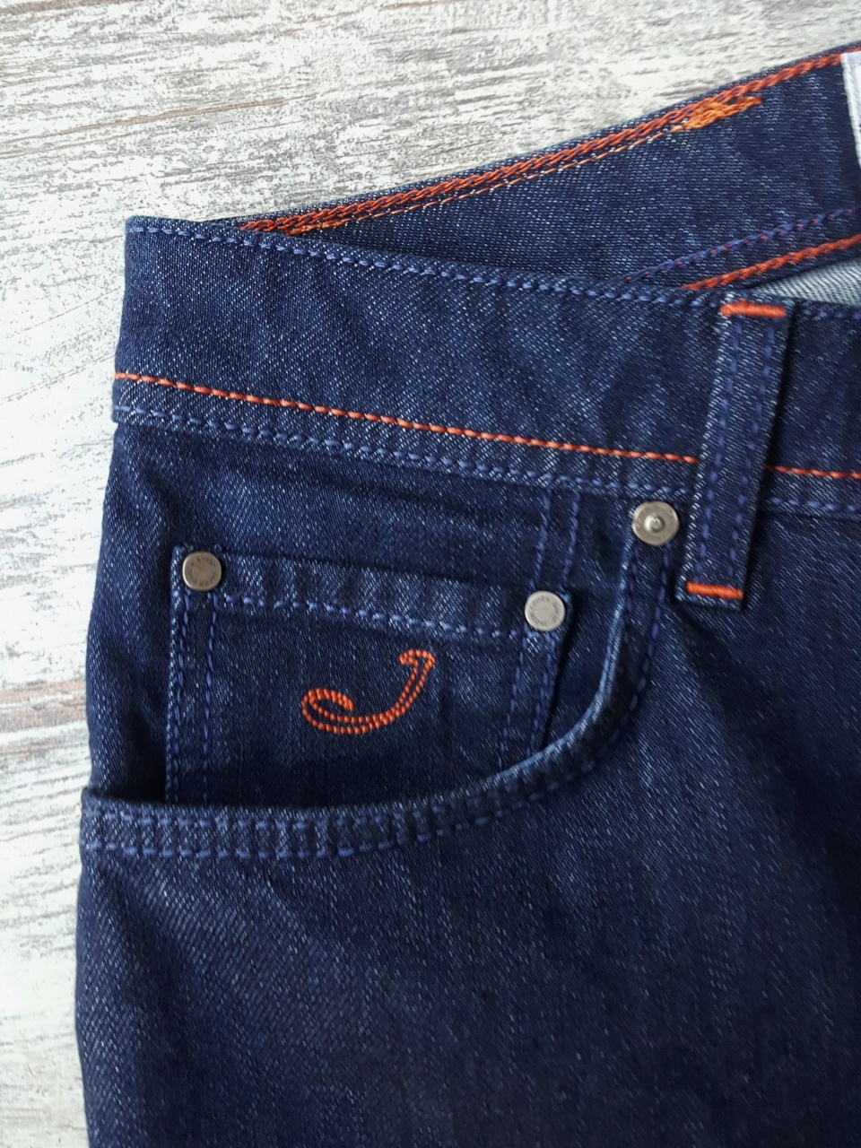 Сзади на правом бедре джинсы имеют фирменный ярлык из кожи пони оранжевого цвета с вышитым логотипом марки Jасоb Соhёn - буквы «J».