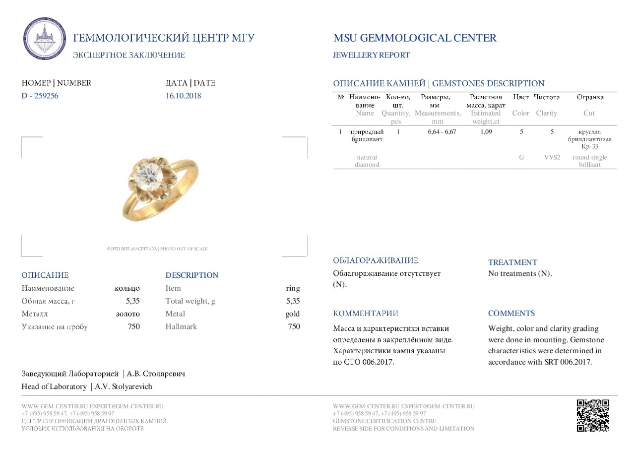 Помолвочное золотое кольцо с бриллиантом 1.09ct