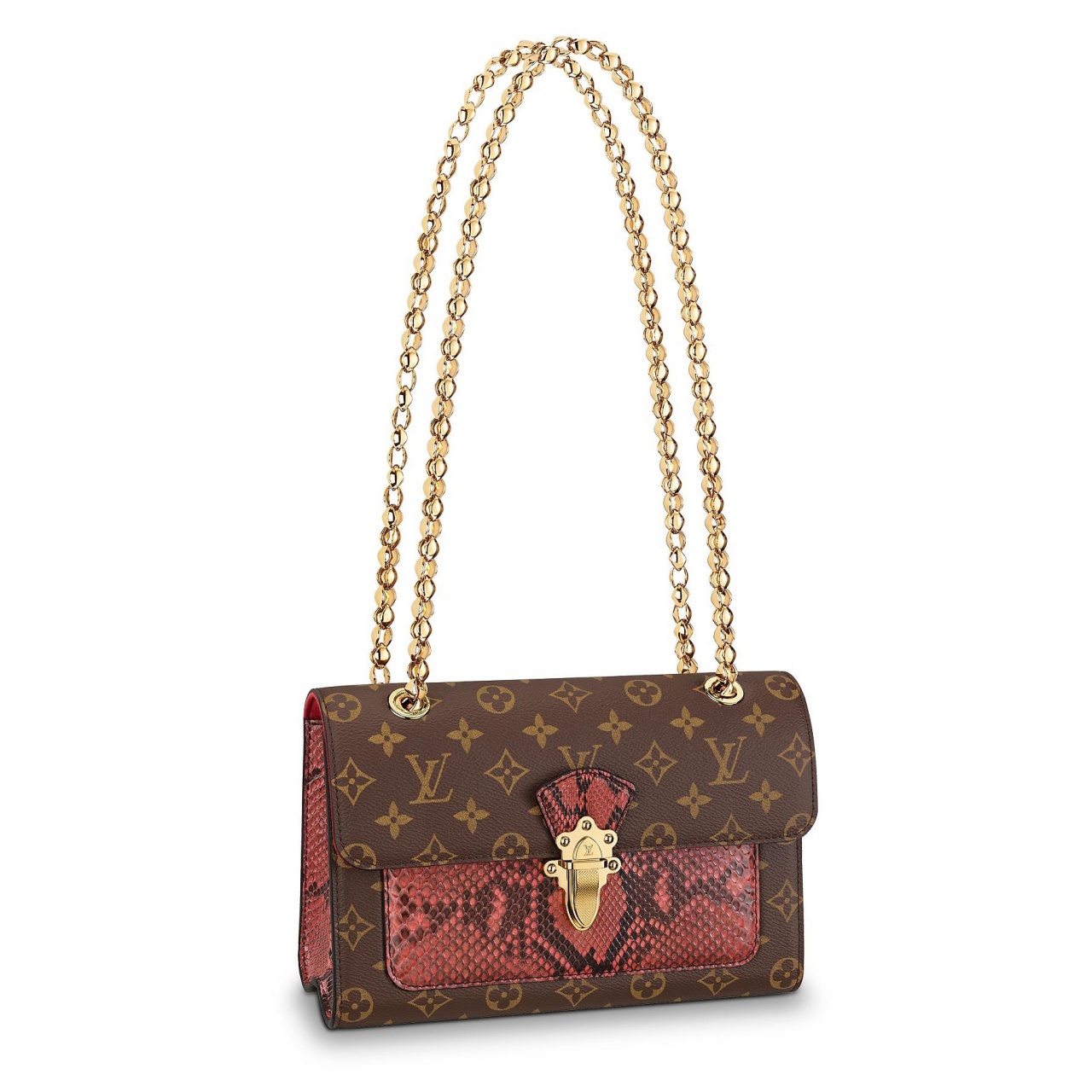 "Опираясь на свои архивы исторических сундуков, Louis Vuitton создал новую универсальную сумку Victoire из канвы Monogram и кожи питона, которая великолепно подойдет как для дневного, так и для вечернего образа. Застежка и скользящая цепочка из блестящего металла предлагают новую интерпретацию классических кодов Дома Louis Vuitton в стильном современном ключе.