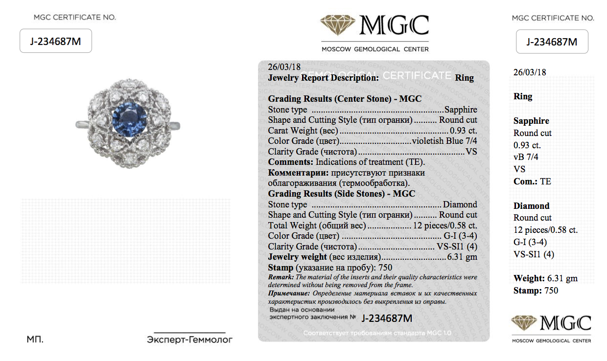 Кольцо из белого золота с сапфиром 0,93 карат и бриллиантами 0,58 карат (сертификат МГЦ)