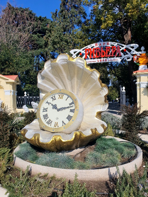 Композиция "Раковина с часами" или часы-ракушка находится перед главным входом старейшего парка "Ривьера" города Сочи.
