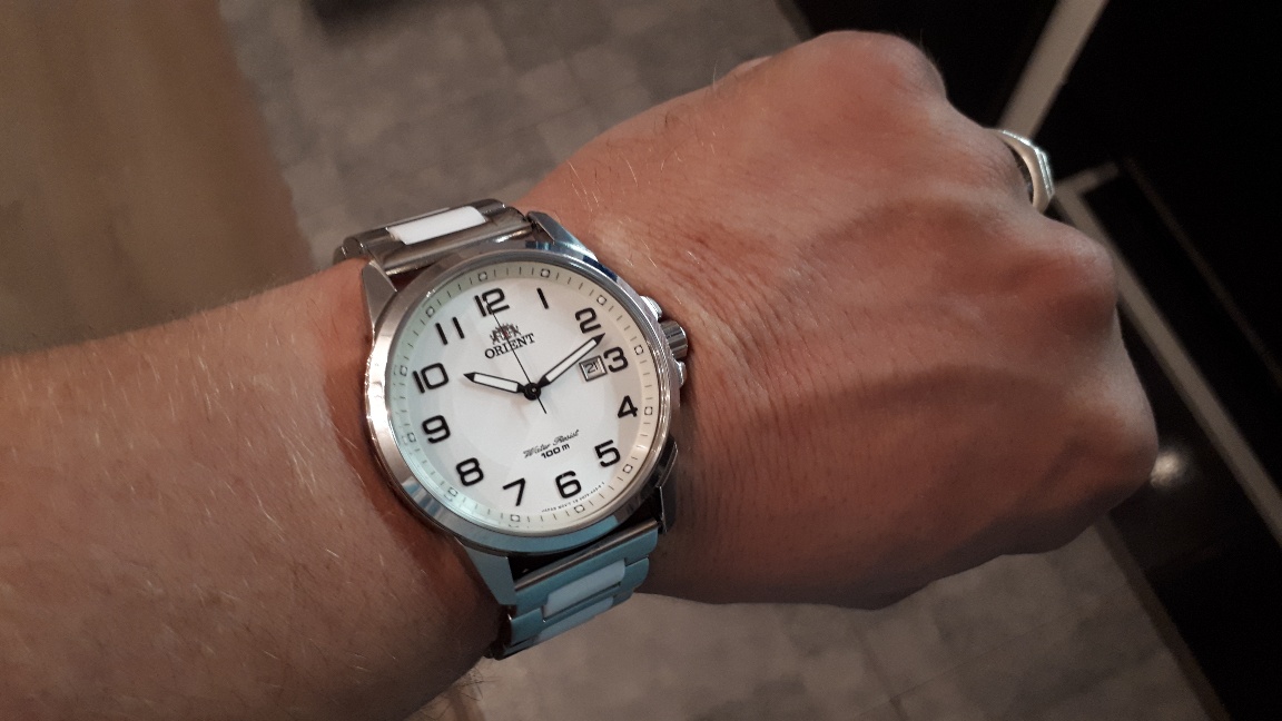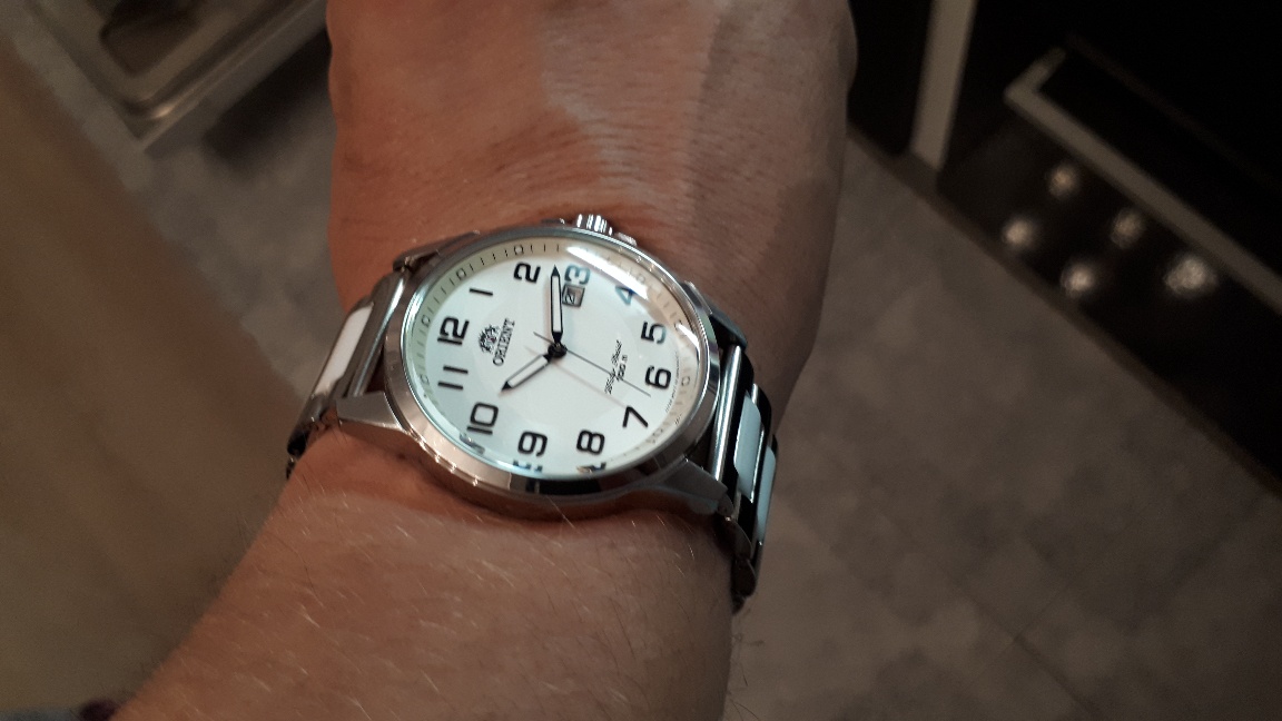 Собственно выставляю на продажу универсальный кварцевый Ориент с циферблатом белого цвета.