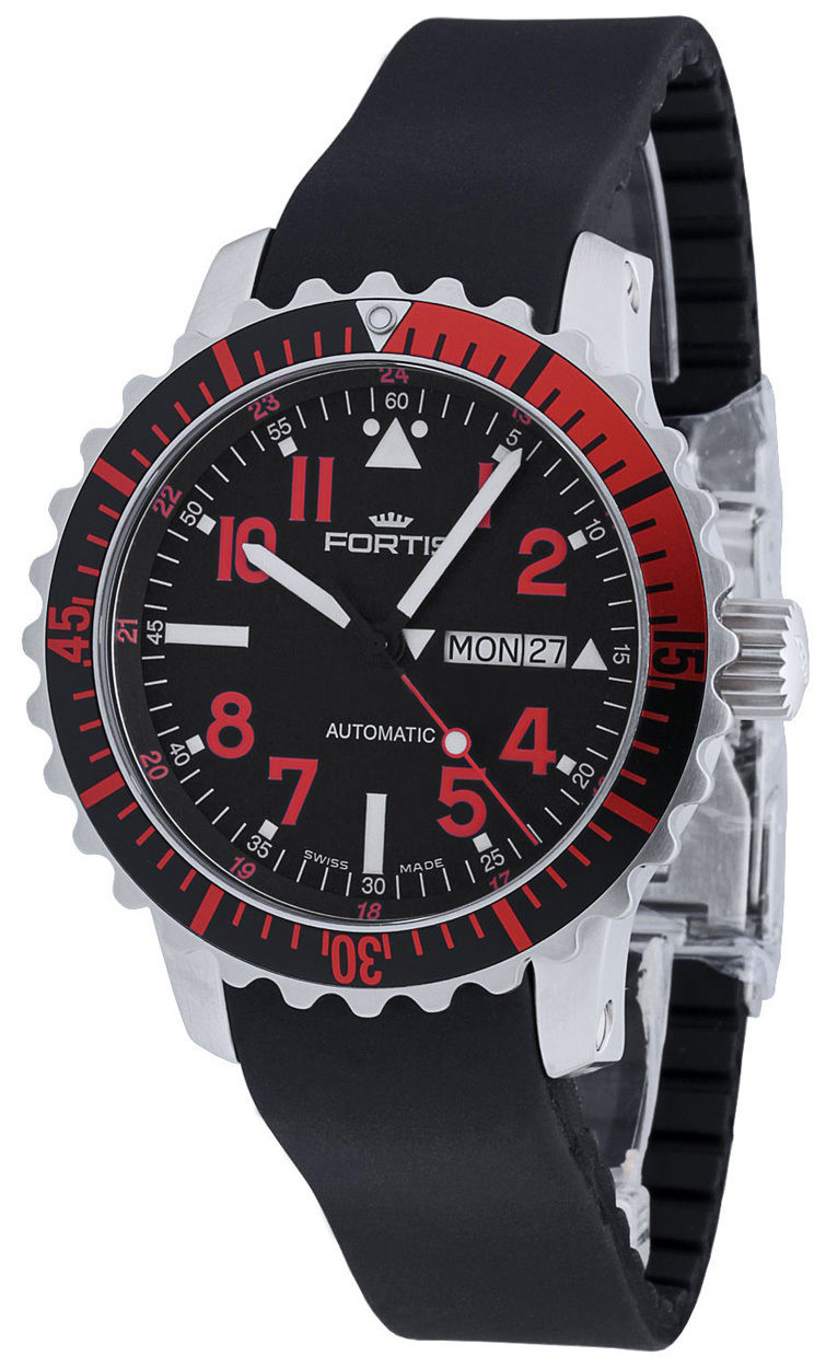 Задняя крышка и заводная головка с логотипом марки и историческим мотивом FORTIS, винтовое соединение с корпусом.
