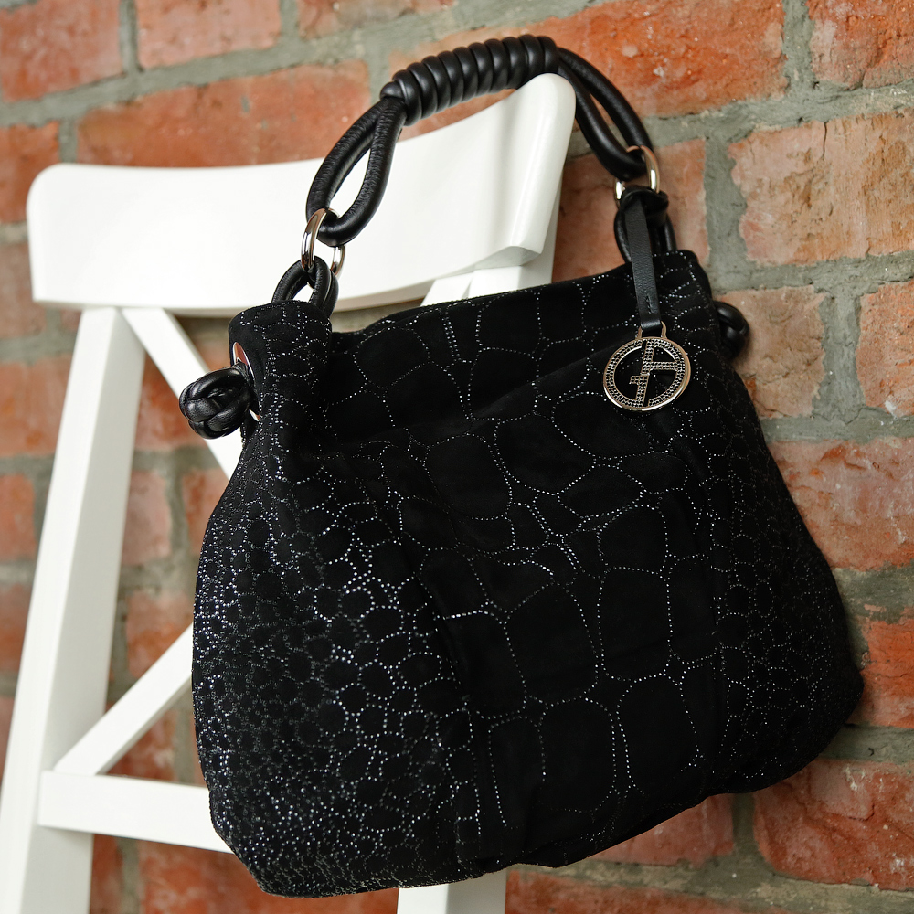 Поверх замши - уникальная отделка: изящный узор из черных кристаллов. Кристаллы, если присмотреться, расположены не абстрактно а весьма конкретным образом: узор, который они образуют, вдохновлен фактурой кожи крокодила. Очень необычно и красиво. Мистический блеск черных кристаллов на черной замше при движении создает выразительный эффект.