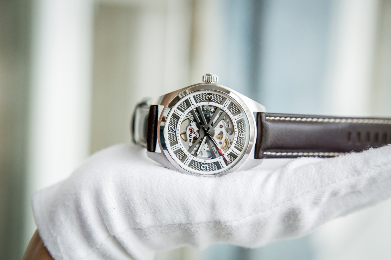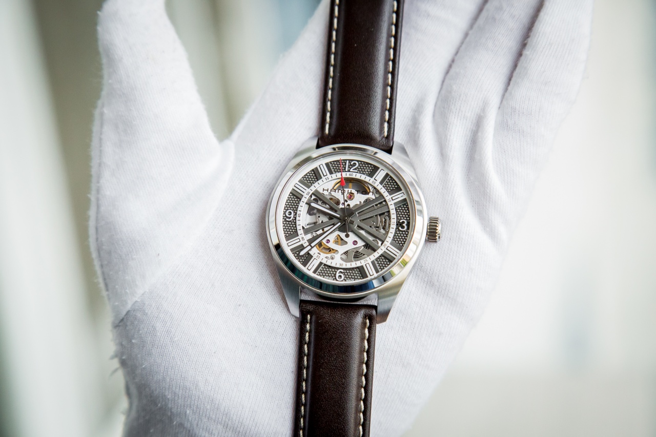 Khaki Skeleton - это высокотехнологичная современная модель, в дизайне которой большое внимание уделено деталям. Скелетонизированный трёхуровневый циферблат со структурной отделкой «пчелиные соты», частично перекрывающийся лопастями X-образного пропеллера — потрясающий трехмерный шедевр. В дополнении к этому привлекающее внимание контрастное цветовое исполнение подчёркивает, что данная модель создана для мужчин с сильным характером, желающим выделиться из толпы.