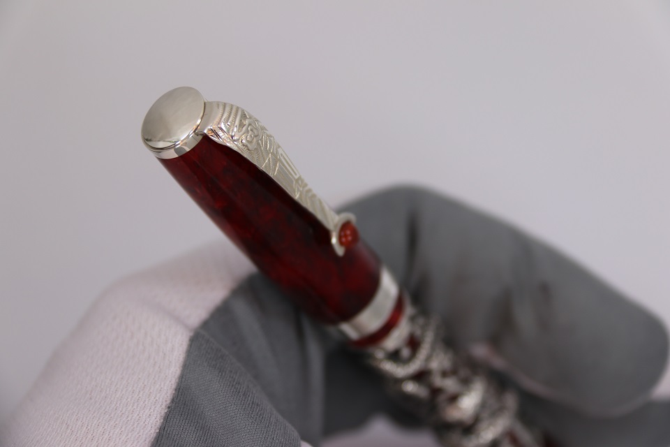Корпус ручки выполнено из смолы особой текстуры «Pietra» («камень» на итальянском) глубокого красно-коричневого оттенка. Вращающийся шарик на конце клипа – фирменный штрих Montegrappa - выполнен из полудрагоценного камня сердолика.