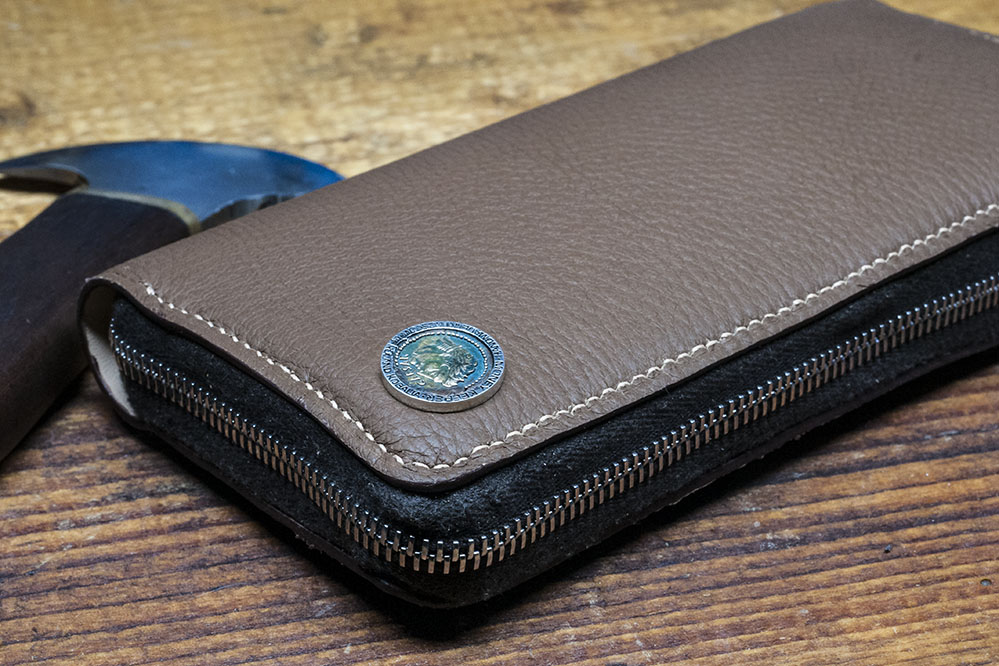 На кошелька шильда из серебра, в которую вмонтирована бронзовая монета, имитирующая древнеримскую, с изображением Цезаря. Гарантирует подлинность ручной работы.