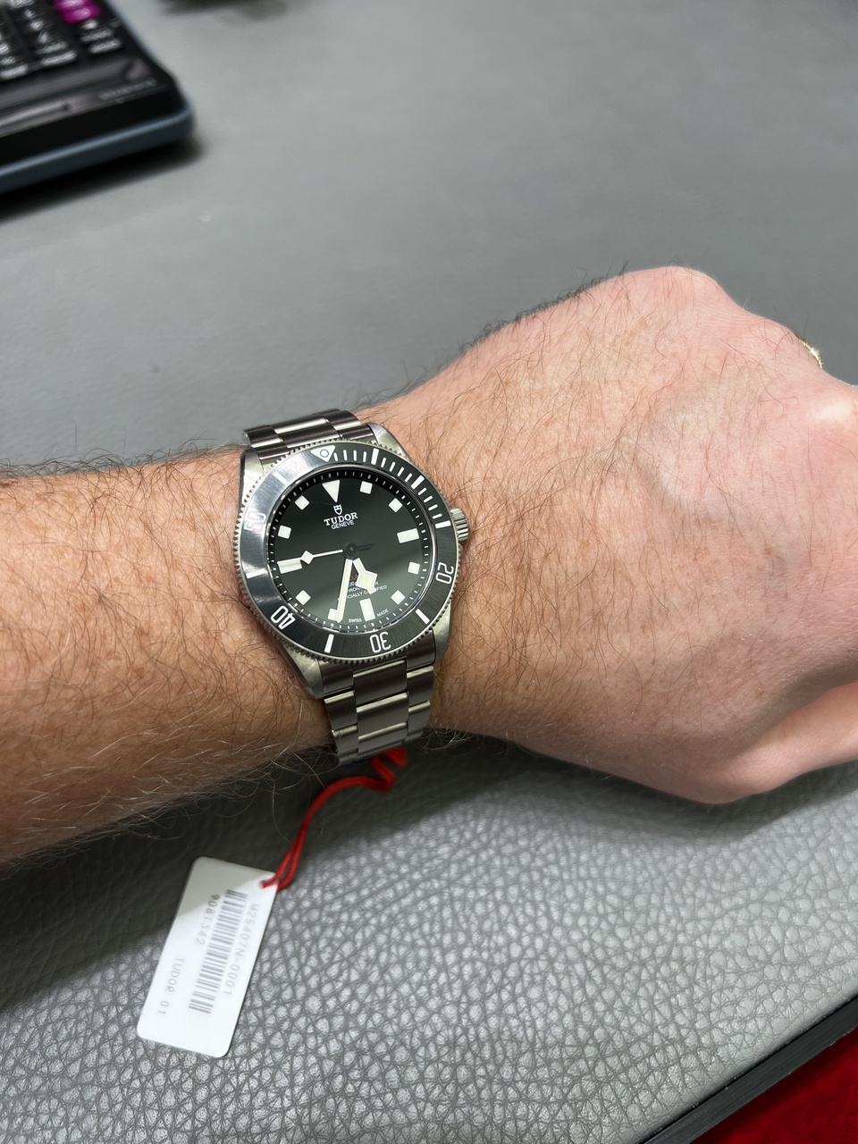 Зашел в Тюдор. Там лежали рейнджеры(взял в руку и даже не стал примерять), и предмет данной темы - новинка Tudor Pelagos 39. Я всегда, с учетом своего опыта, считал, что Тюдор в принципе - это недочасы. Да простят меня фанаты марки. Ну как-бы закос на Ролекс, легенда там за уши притянутая, качество второсортное, косяки, простота, да и стрелки эти тупые на любителя.. Но здесь, увидев часы за витриной, обтянутые в пленку, я заинтересовался и захотел примерить. Мне дали часы, я надел их на руку и.. О, часовые БОГИ! Я захотел примерить их без пленок