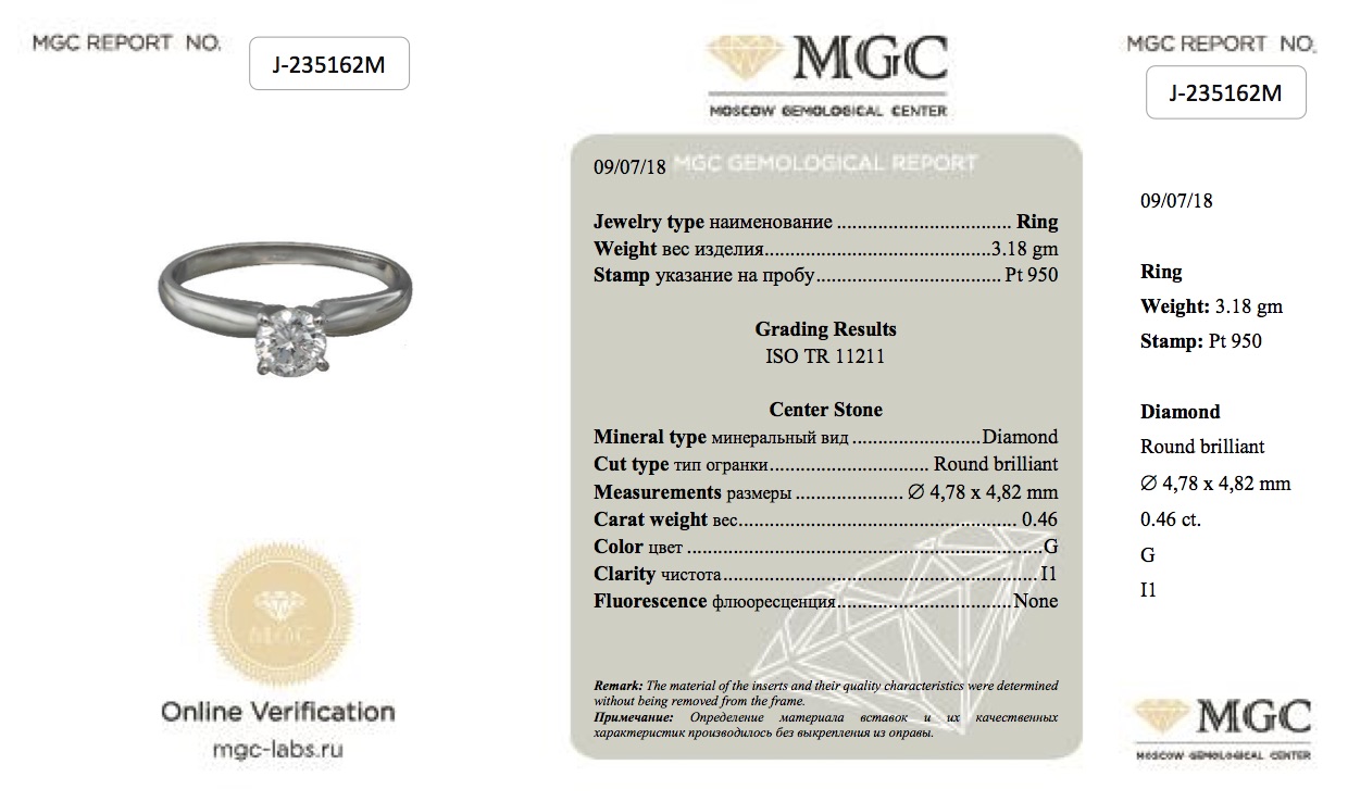 Кольцо из платины с бриллиантом 0,46 карат (сертификат МГЦ)