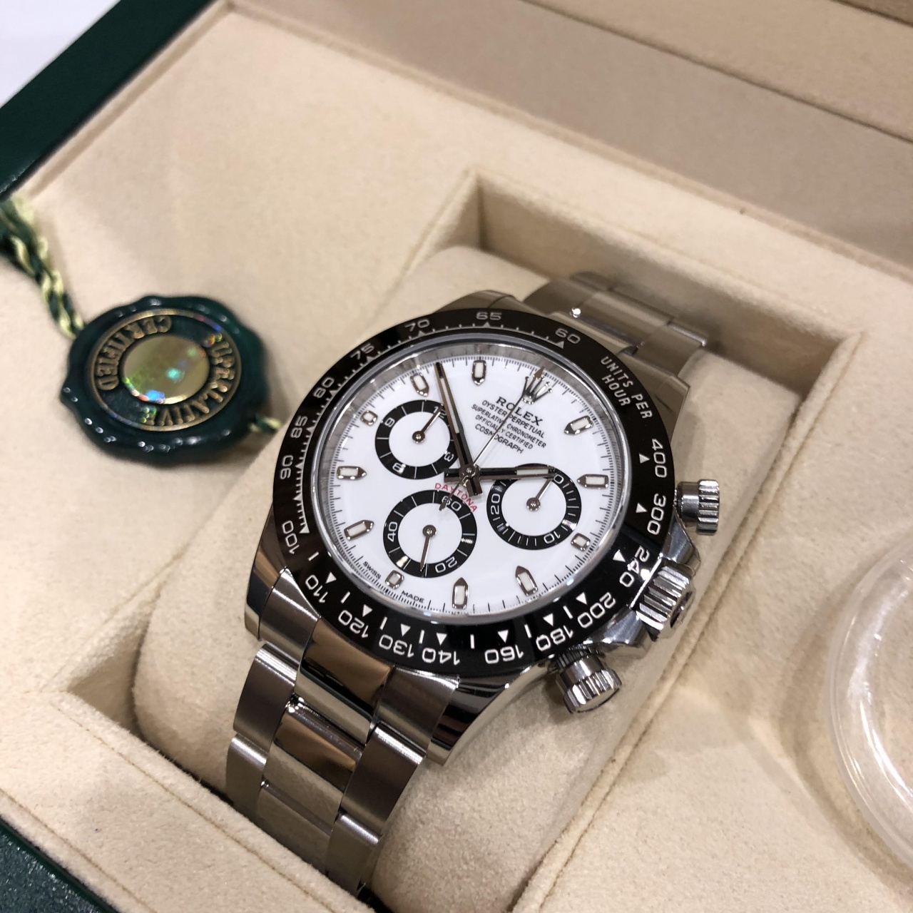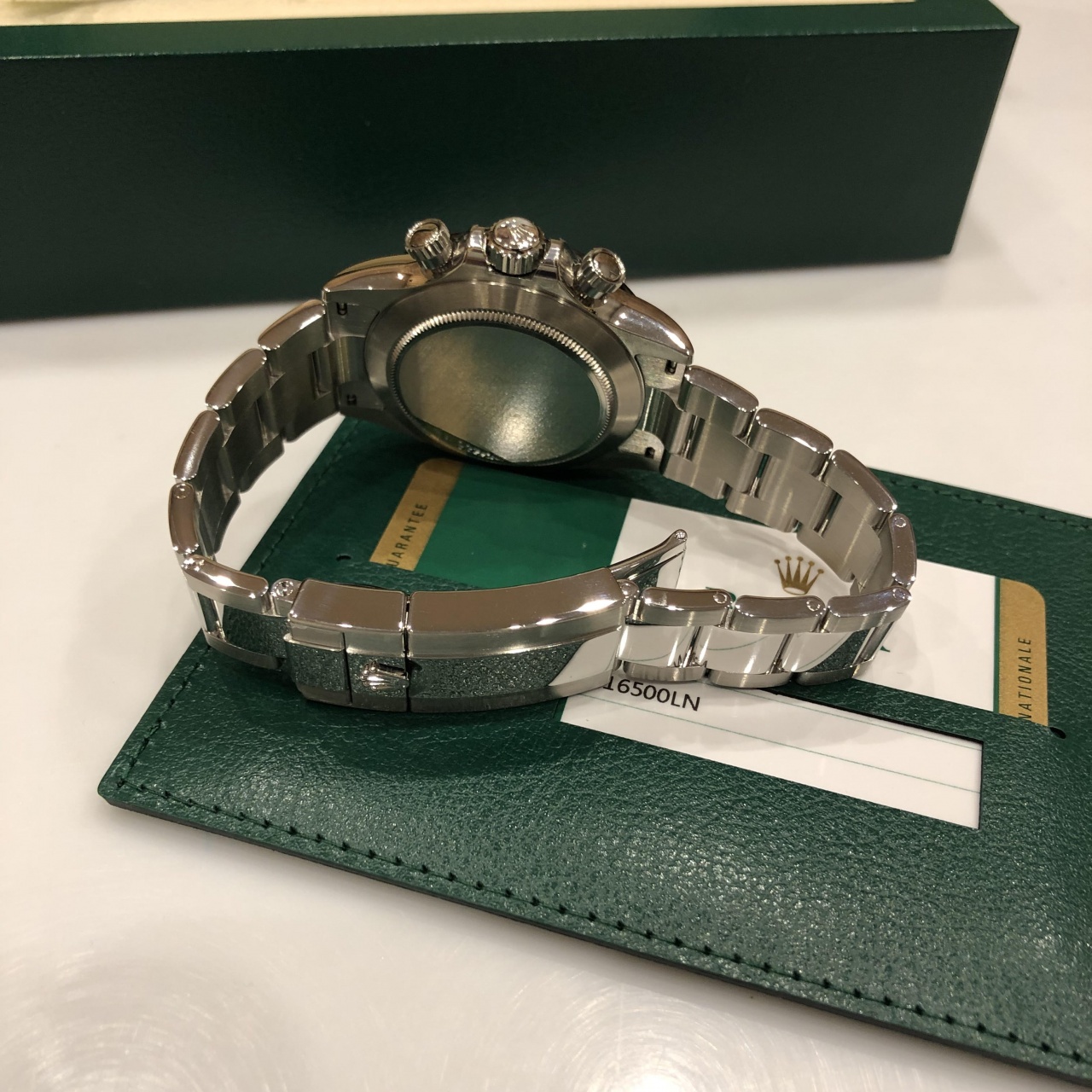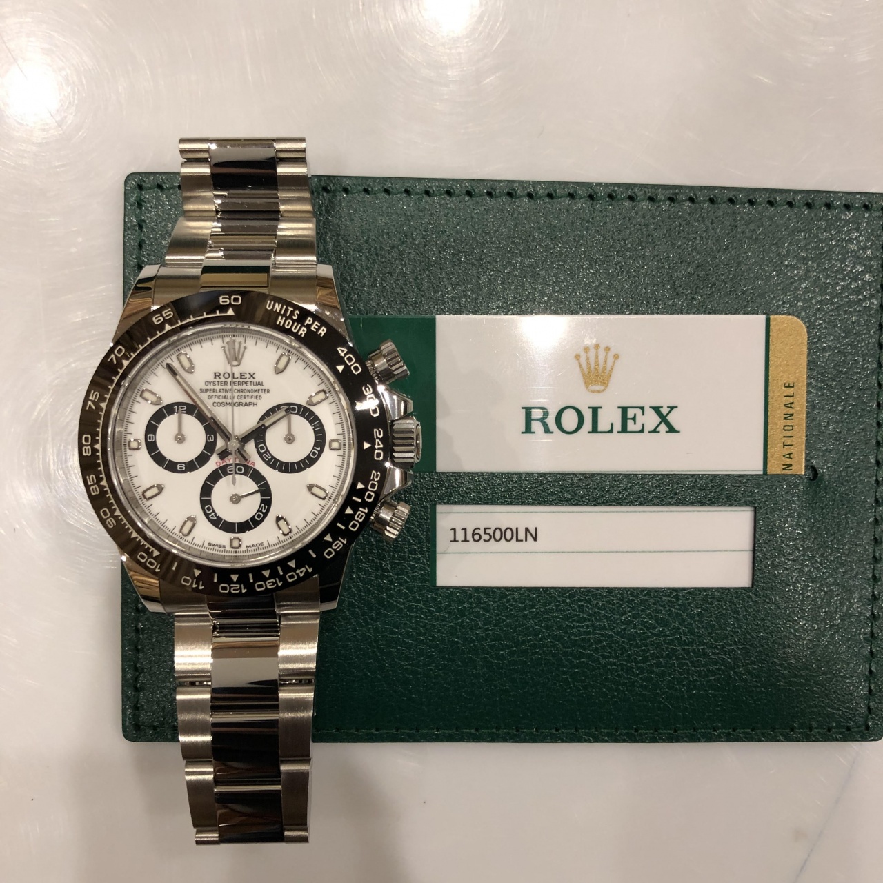 Часы Rolex Cosmograph Daytona 116500LN были представлены на часовой выставке Baselworld в 2016 году. Обновленная модель получила керамический безель и сразу же завоевала огромную популярность. Хронометр Ролекс 116500LN в 40-миллиметровом корпусе из нержавеющей стали 904L с белым циферблатом дополнены браслетом Oysterlock из нержавеющей стали. На циферблате отображаются при помощи центральных стрелок часы, минуты и секундный счетчик хронографа. Три симметричных суб-циферблата показывают минуты и часы хронографа, а так же секунды текущего времени. На керамическом безеле расположилась тахиметрическая шкала. Механизм - мануфактурный калибр Rolex Perpetual 4130 с запатентованной спиралью баланса Parachrom, гарантирующую надежную защиту от сотрясений, температурных изменений и магнитных полей. Запас хода - 72 часа.
