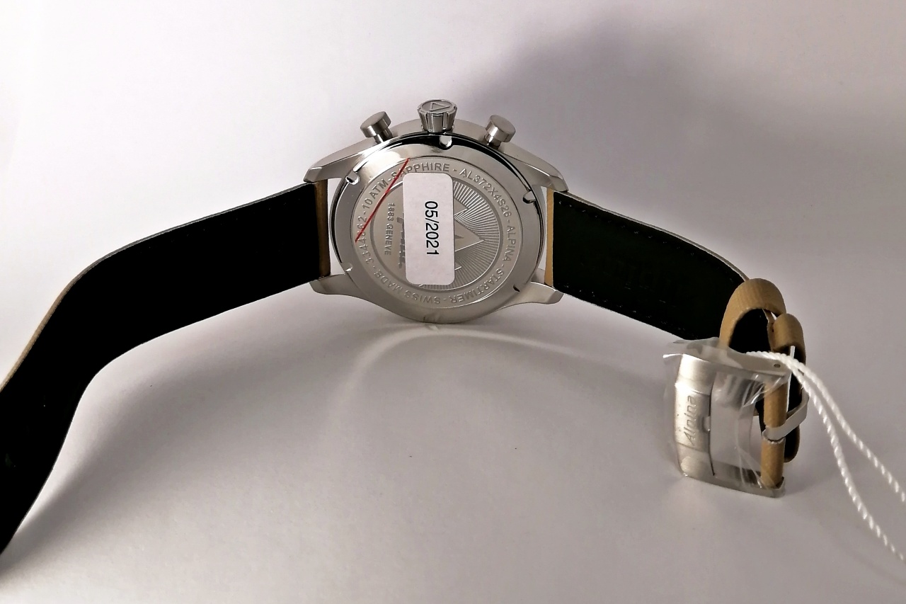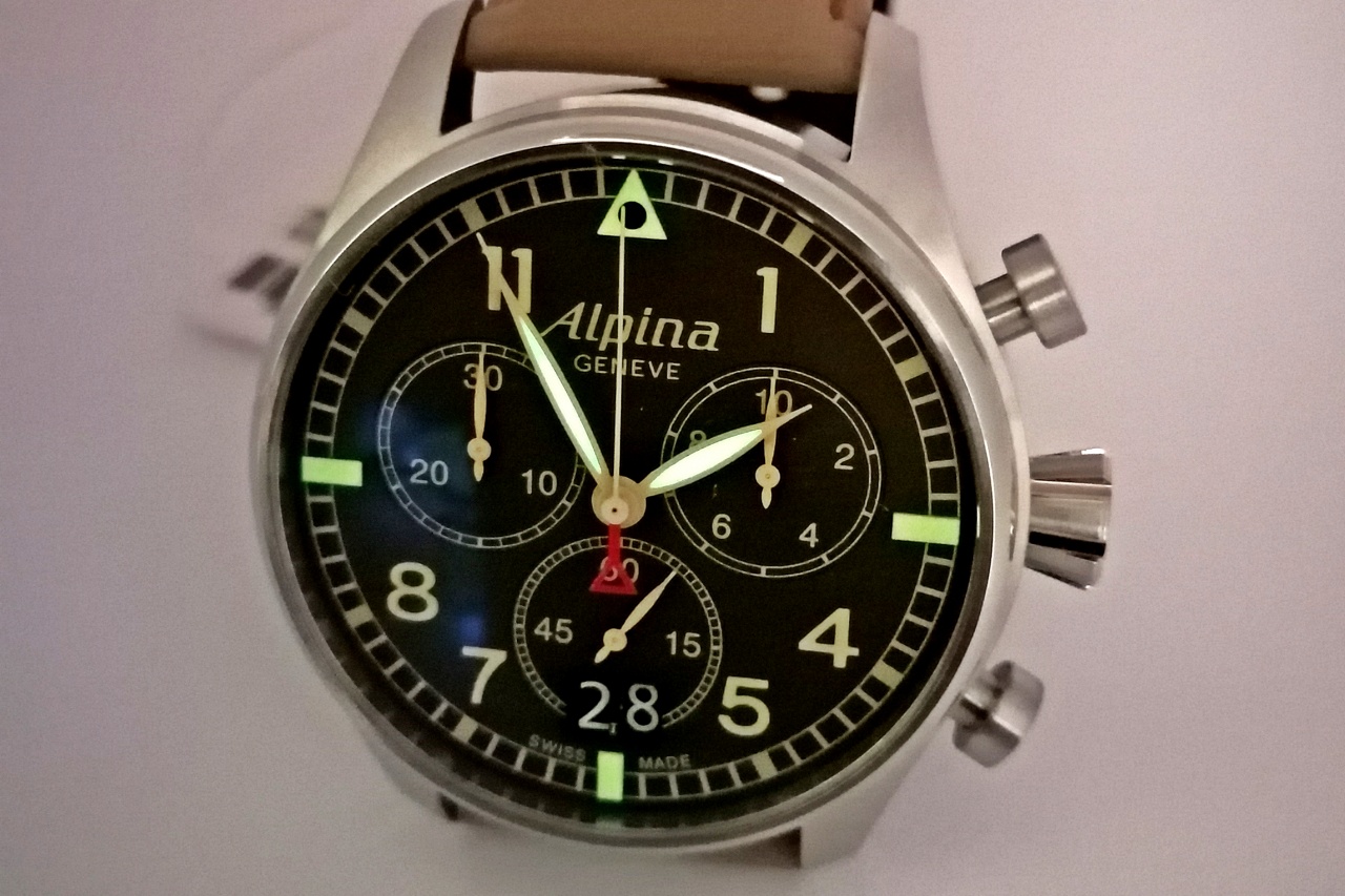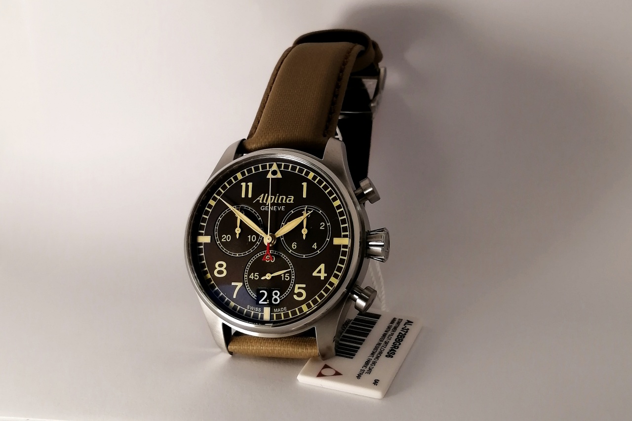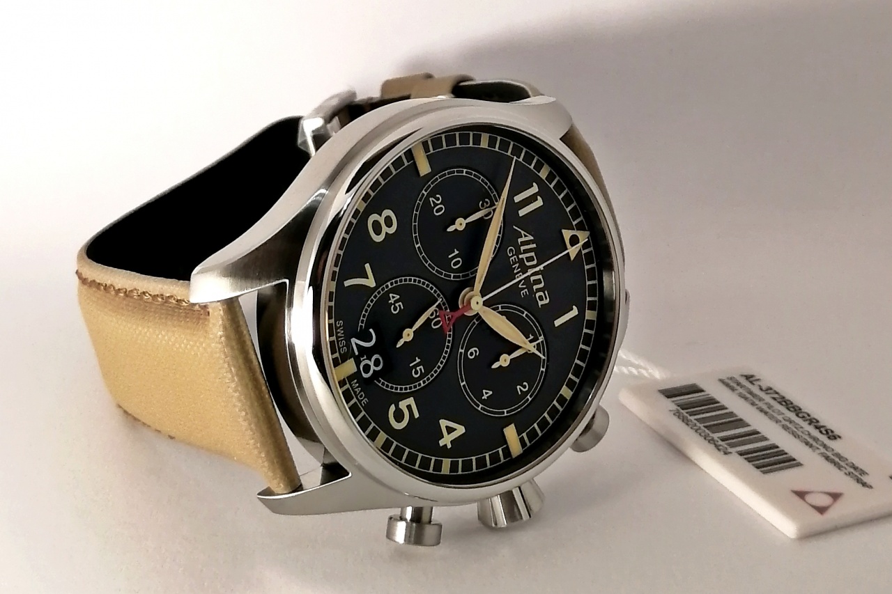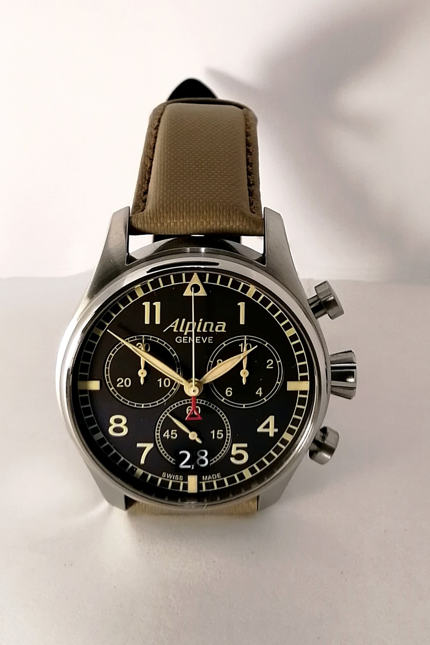 В продаже новые, оригинальные мужские часы Startimer Pilot Big Date Chronograph. Круглый корпус выполнен из нержавеющей стали 316L и имеет размер 44мм, поверхность с матовой шлифовкой (сатинирование) и полировкой до зеркального блеска. Сапфировое стекло с антибликовым покрытием (эффект отсутствия стекла). Циферблат с рельефной поверхностью, контрастная разметка нарисована в стиле «пилот». Водозащита 10 АТМ. Швейцарский кварцевый механизм, калибр AL-372 на 13 камнях, с аналоговой индикацией, с хронографом и большой датой. Функция хронографа с центральной секундной стрелкой, 30-минутным индикатором и указателем 1/10 секунды. Светонакопительное люминесцентное покрытие на стрелках и разметке циферблата. Заводная коронка имеет винтовую фиксацию. Задняя крышка с гравированным медальоном имеет винтовое соединение с корпусом. Комбинированный ремешок с подложкой из натуральной кожи, текстильная поверхность, литая застежка-пряжка.