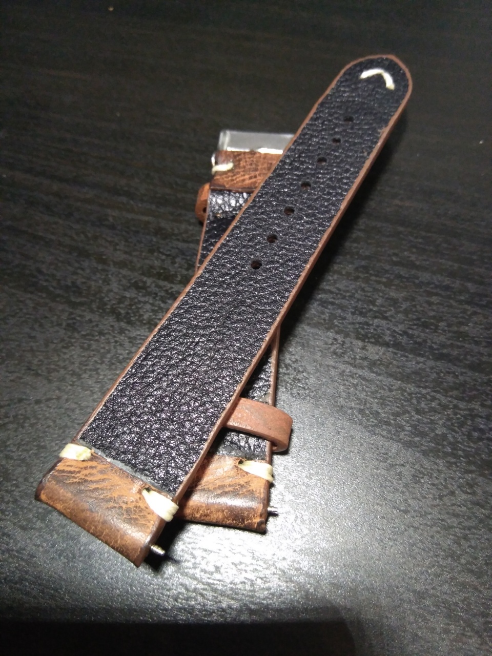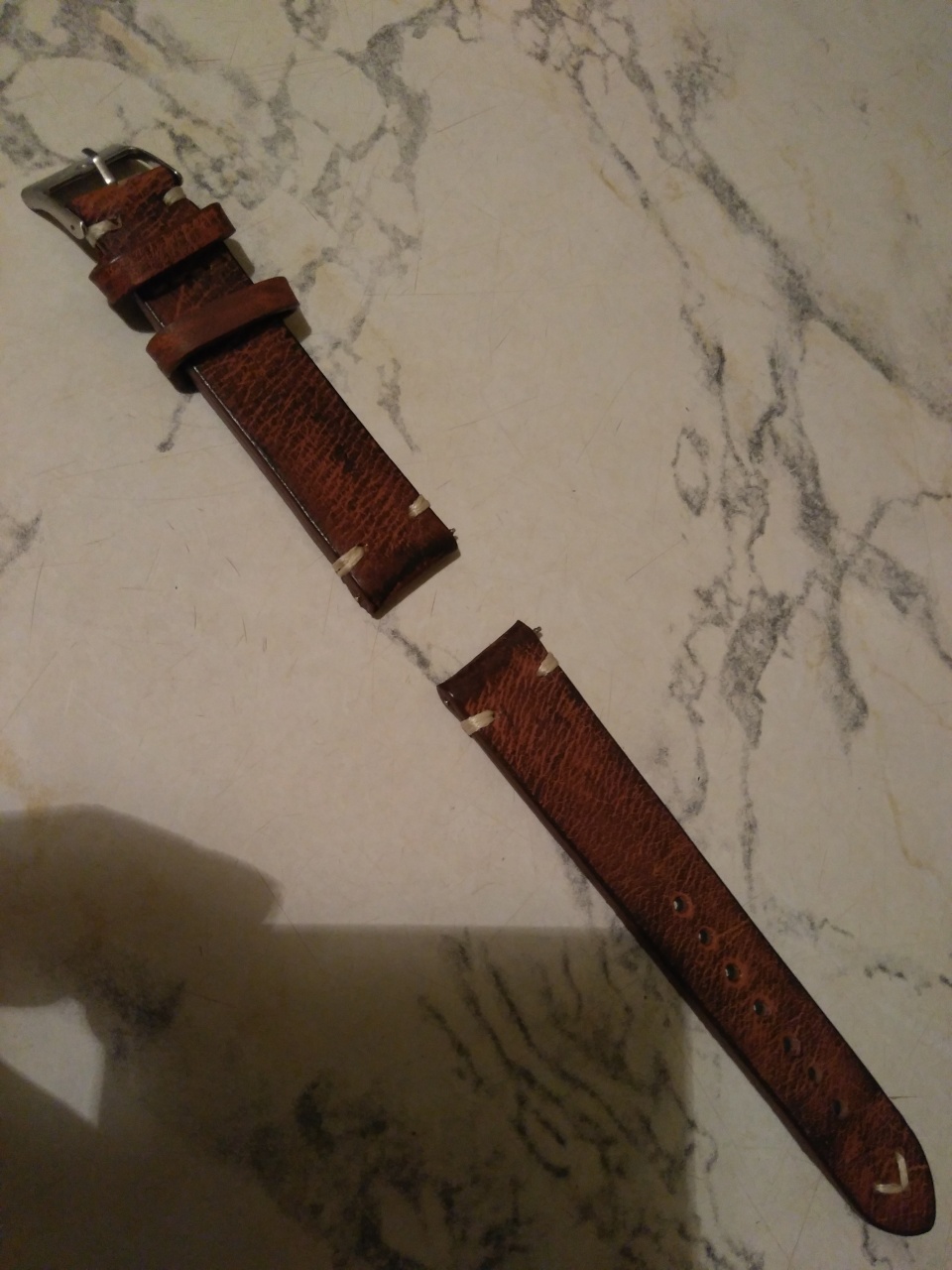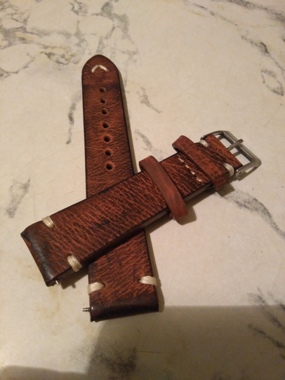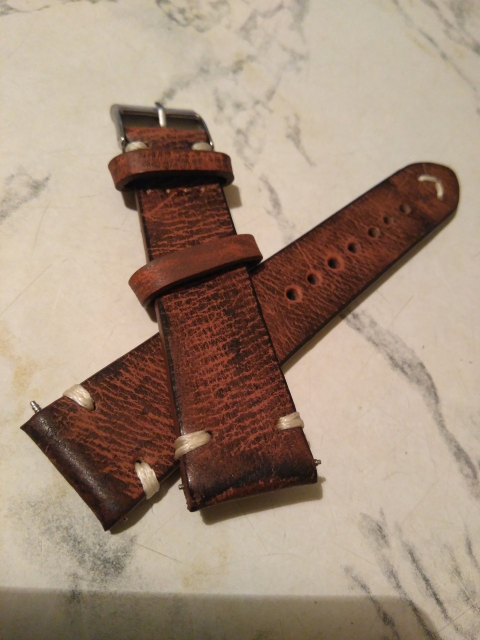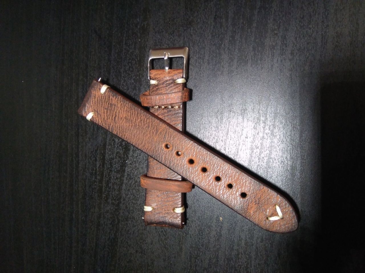 Кожаный новый ремешок винтаж для часов 20-22 мм. Ремешок идеально подойдет для часов Seiko 5 Sports Sand Khaki SNZG07J1. Кожа ремешка НЕ прессованная, а натуральная (легко проверить - при попадании воды натуральная кожа немного (иногда и сильно) темнеет, так как впитывает воду, а прессованная не темнеет, так как за счет всяких склеивающих смол и синтетических веществ материал воду не впитывает). Цена 3900 руб.