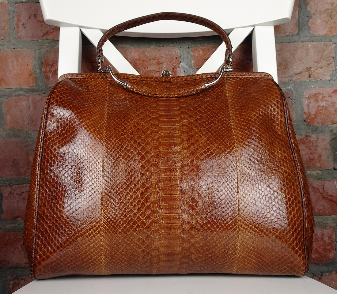 Сумка ОЧЕНЬ нетривиальная и по-настоящему крутая: сочетание оригинального формата, оптимального размера, невероятно изысканного облика и стройного силуэта, выполненная из кожи питона фантастически красивой выделки и окраса. См. фото.