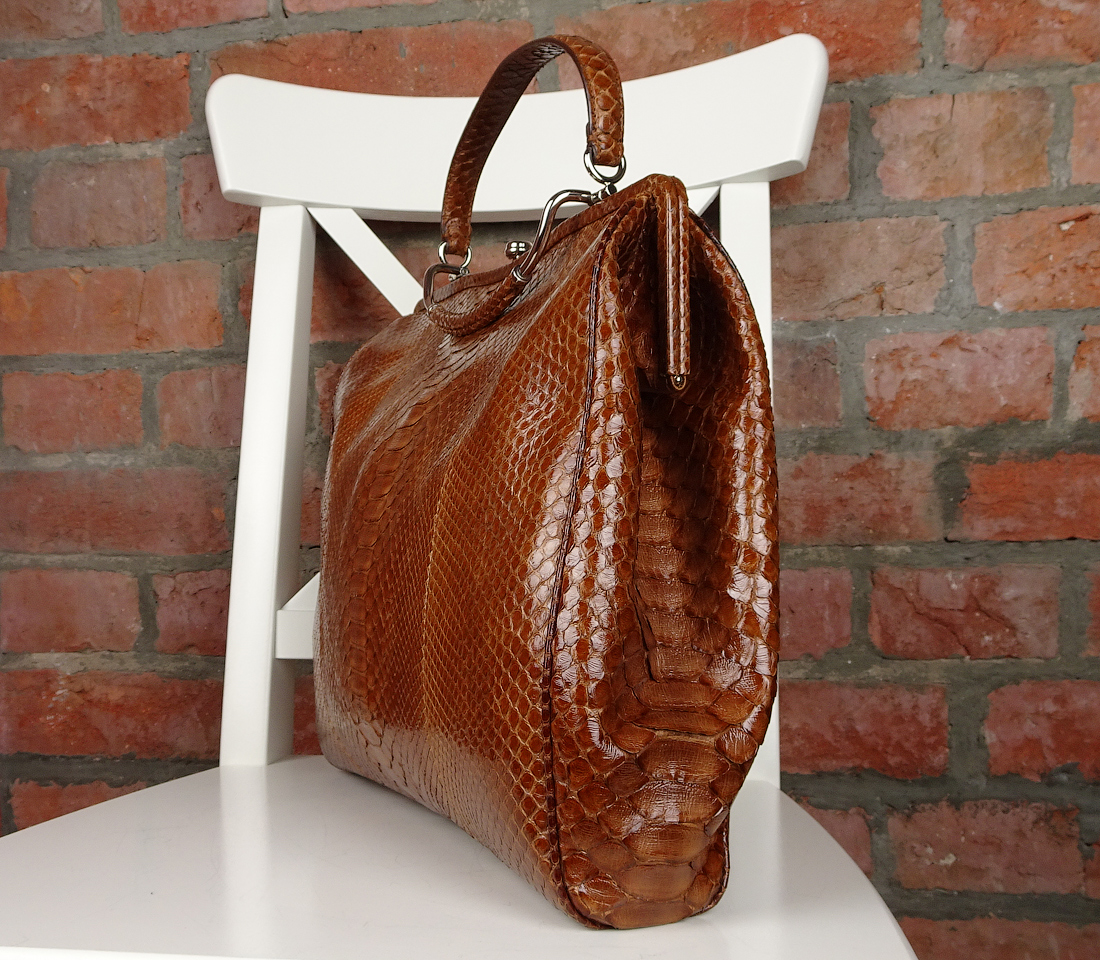 Сумка действительно выделяется, не только роскошным исполнением из кожи питона, но и элегантным и оригинальным форматом: в этой модели линии деловой сумки-портфеля дополнены харизматичными элементами классических женских сумок, таких как, например, закрытие а-ля саквояж.