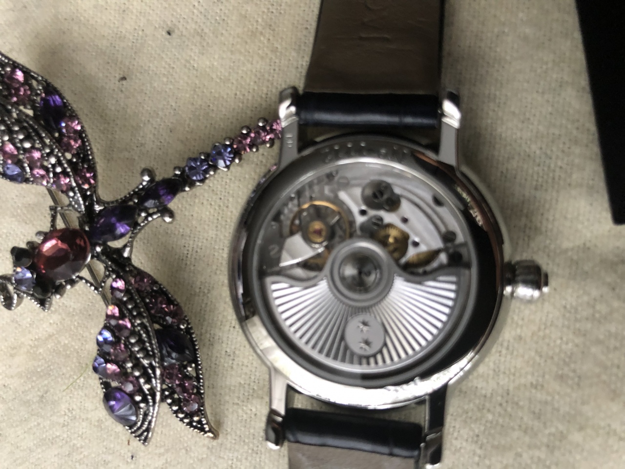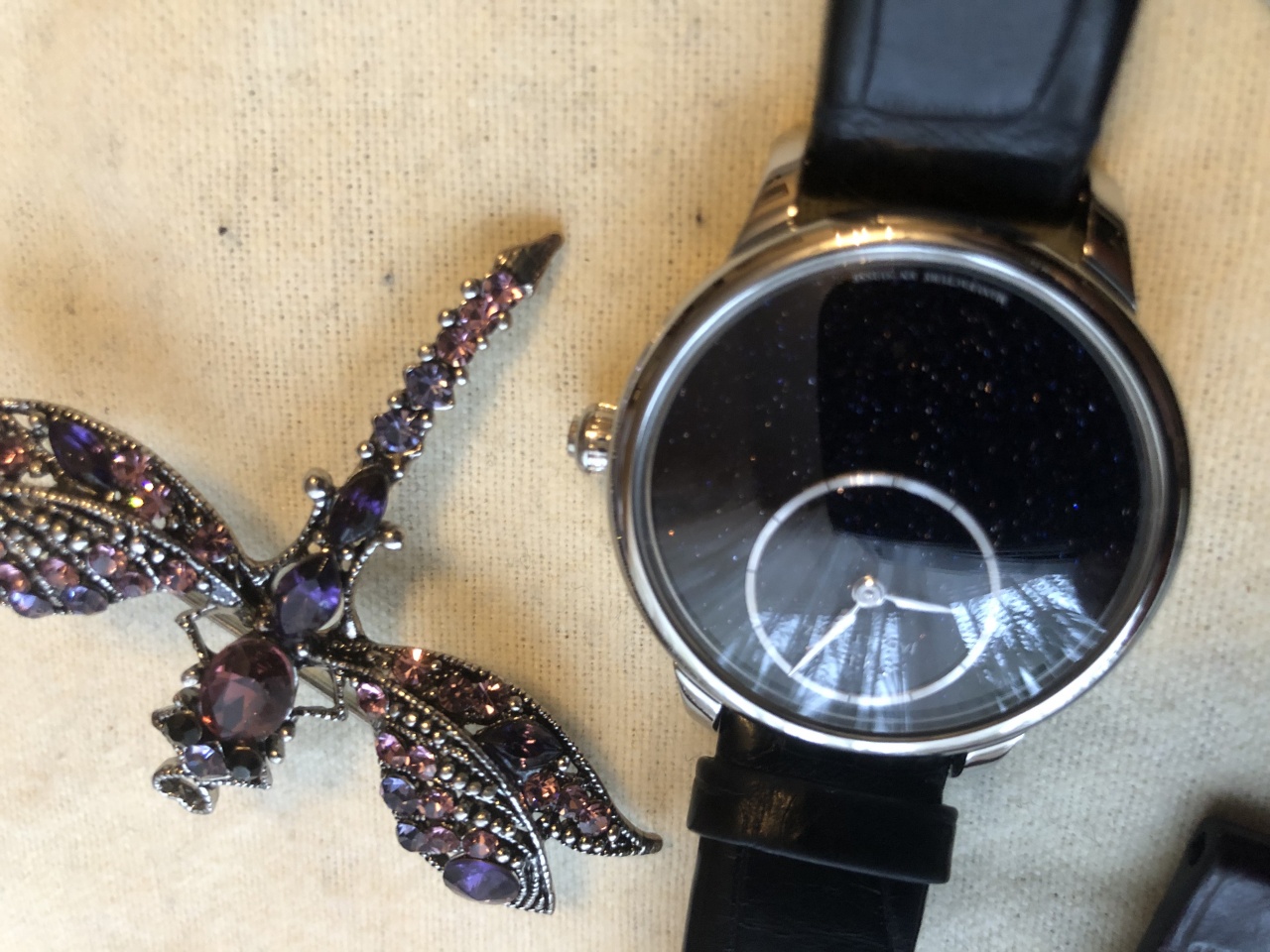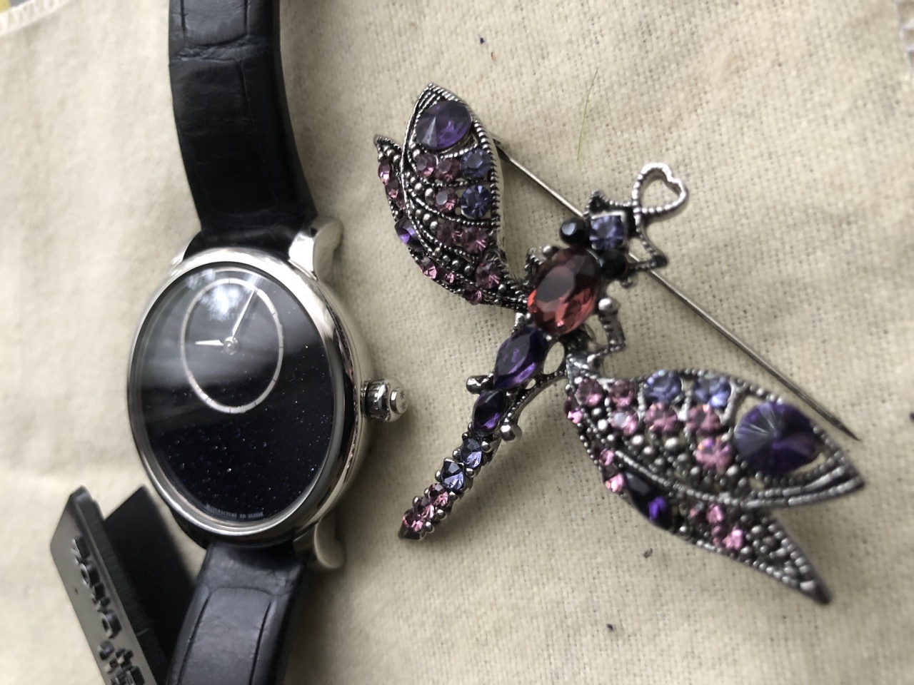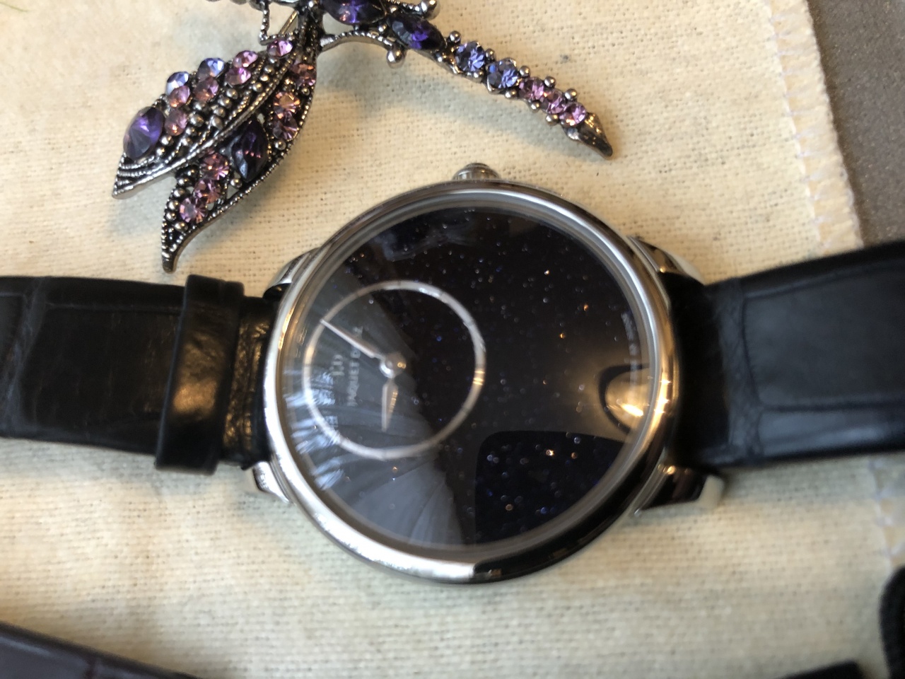 В комплекте с лимитированным крокодиловым ремешком ( дополнительно кроме оригинального). В подарок также идёт брошь.