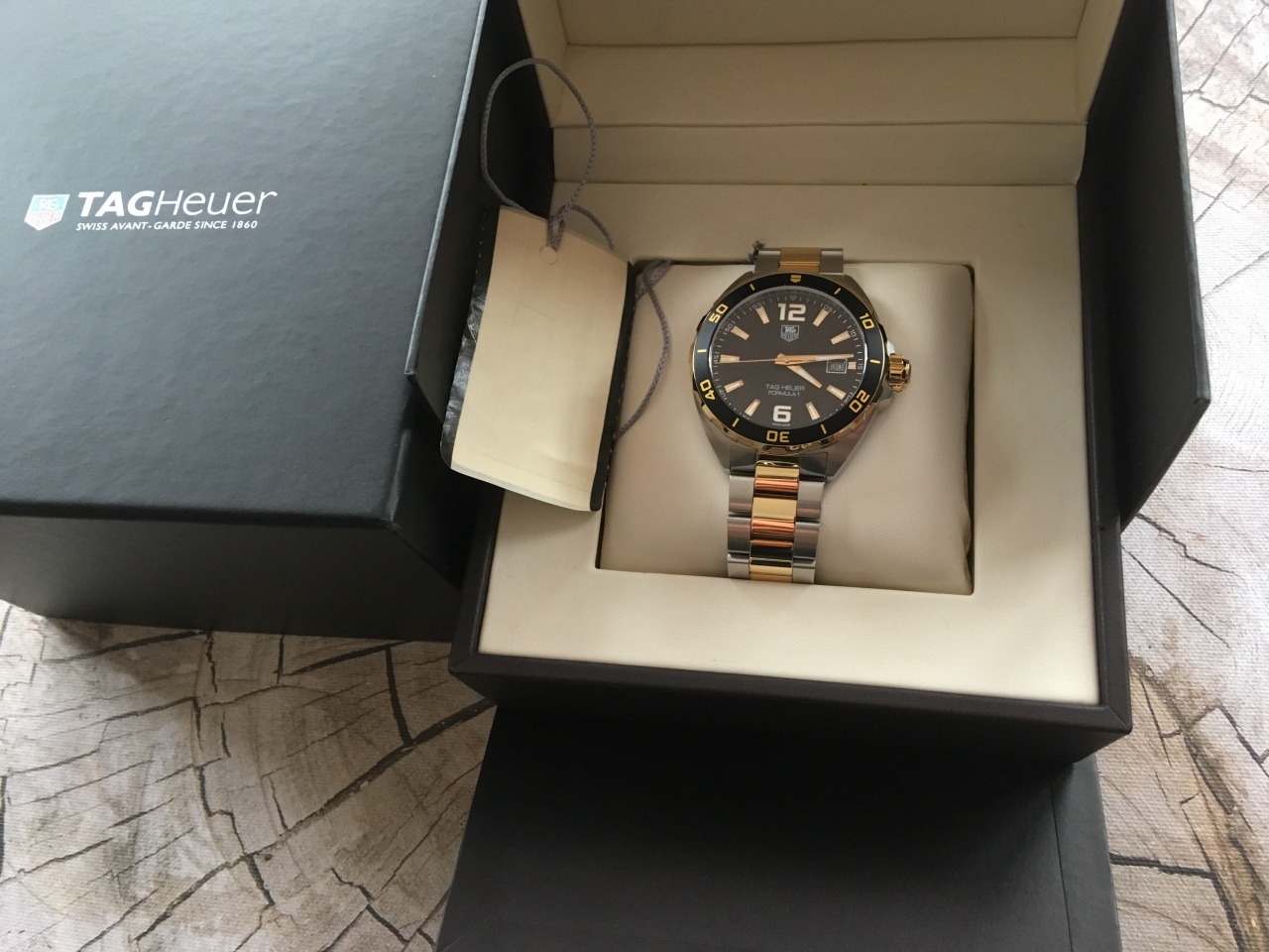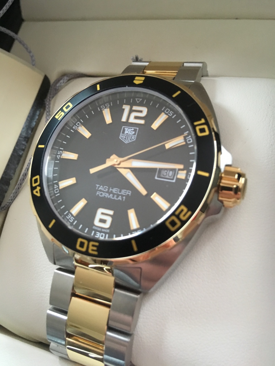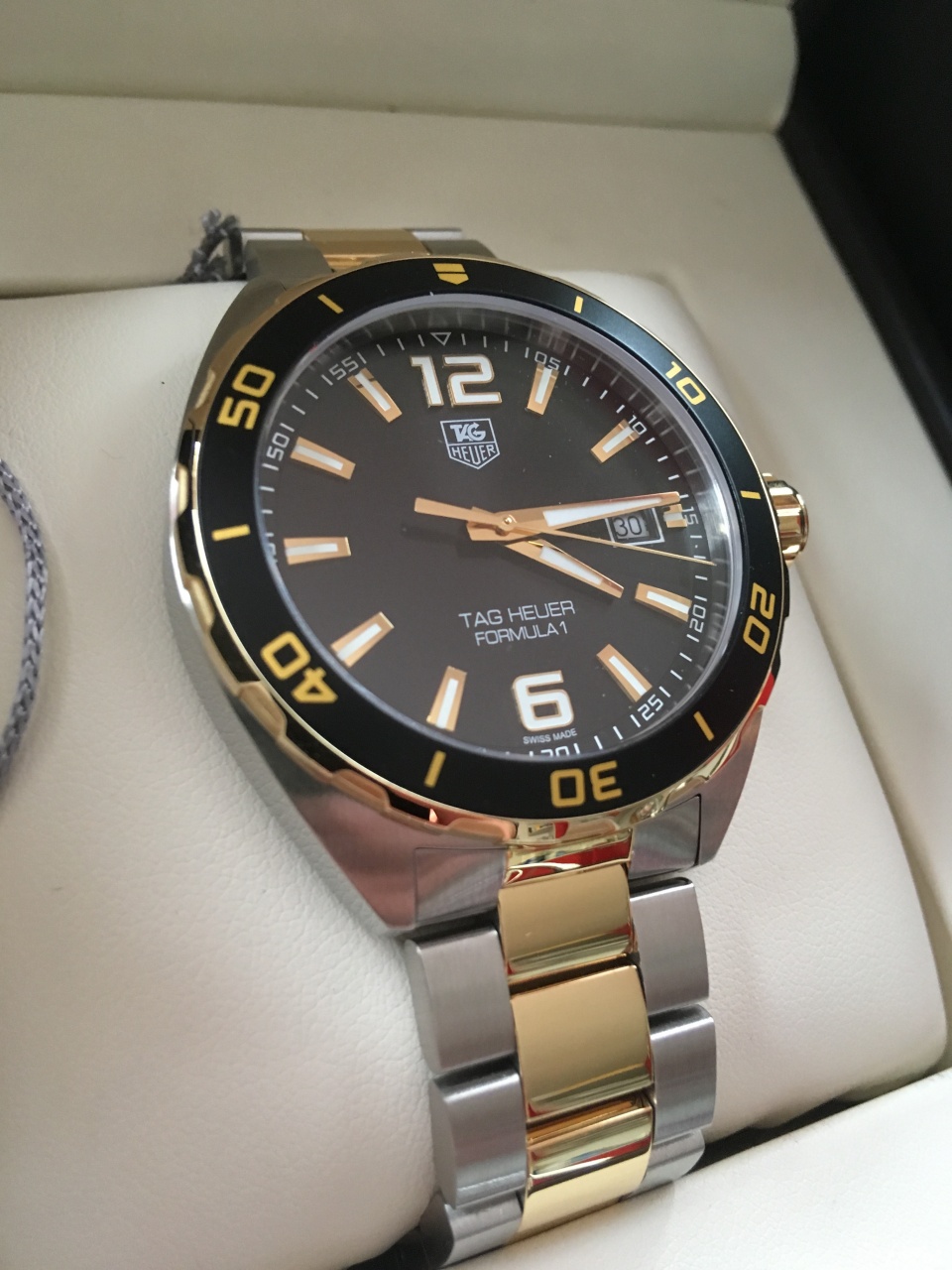 В наличии яркие, повседневные, кварцевые часы TAG Heuer Formula 1 WAZ1121.BB0879. Часы куплены в Штатах, Санта-Круз. Карты нет в наличии но часы в базе TAG Heuer и на гарантии до 6 февраля 2020г.. Модель имеет однонаправленный черный безель из стали с позолотой, размеченый минутными индексами, сапфировое стекло, стальной корпус. Современные спортивные трехстрелочные часы из прочных материалов, изящные и модные. Черный циферблат, накладные полированные метки, цифры и часовые стрелки с люминесцентными вставками. Монохромный логотип TAG Heuer. Завинчивающаяся заводная коронка «Easy Grip» из полированной стали с рельефной эмблемой TAG Heuer в форме щита. Браслет из стали с позолоченными элементами, а также двойная застежка из стали. Водозащита 200м.