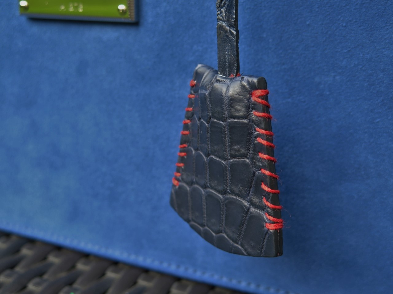Детали и декоративные элементы портфеля изготовлены из стали, покрытой палладием. Внутренняя часть портфеля изготовлена из 100% замши латиноамериканских пекари красного цвета, что на контрасте с синей замшей портфеля смотрится исключительно роскошно, и имеет три больших отделения для переноски документов и прочих вещей, потайные отделения для переноски планшетных компьютеров типа iPad или компактных ноутбуков, хранения ценных бумаг или особо важных документов, одно дополнительное отделение, застегивающееся на молнию с бегунком, и кармашки для хранения 3 ручек, смартфона, визитных карточек, изготовленные из замши.