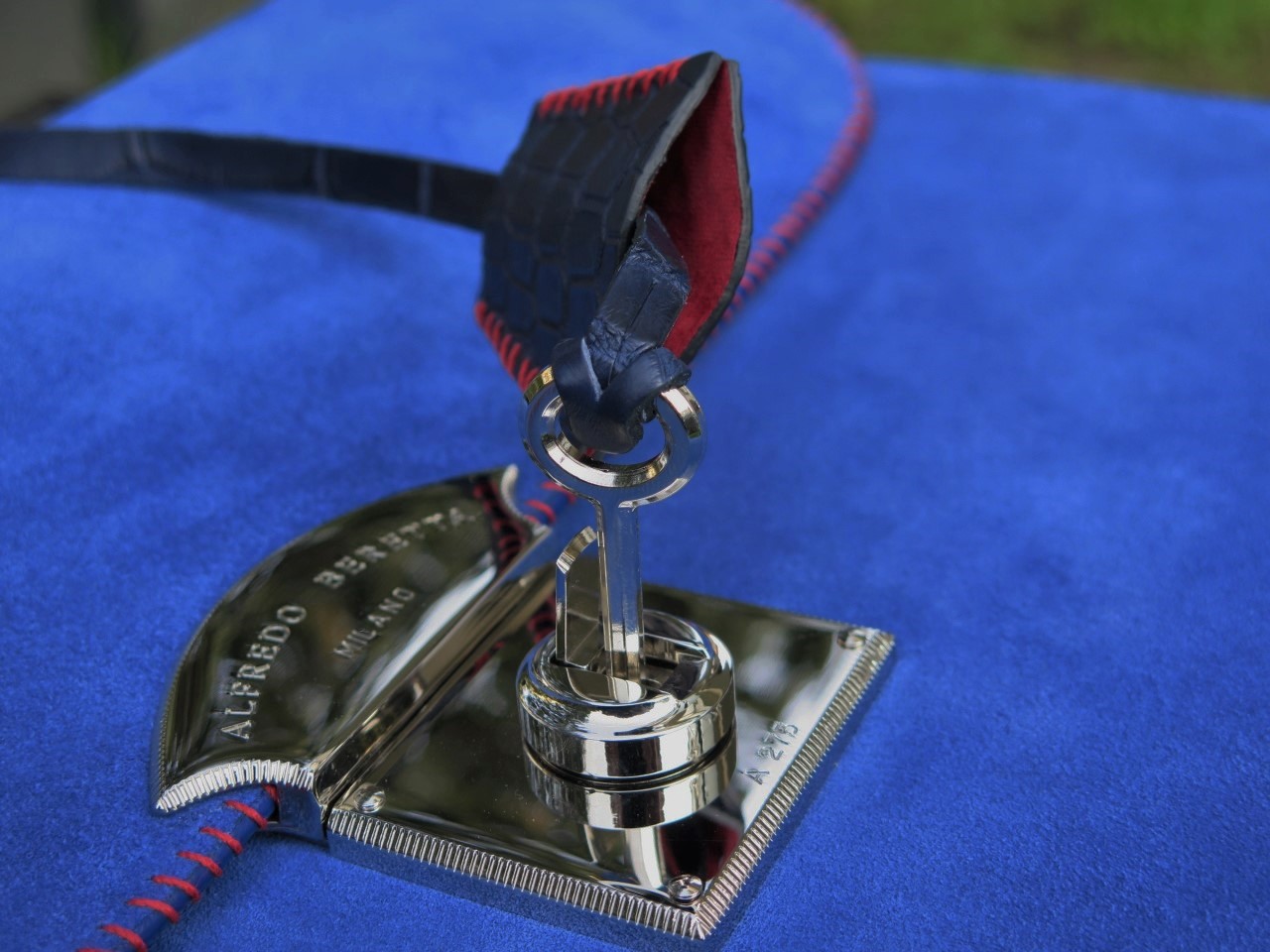 Портфель застёгивается на фирменный замок «Аlfrеdо Веrеttа» c индивидуальным номером "А 275" (запирается на ключ), произведенный в Швейцарии на фабрике, изготавливающей металлическую фурнитуру для изделий Stеfаnо Riссi.