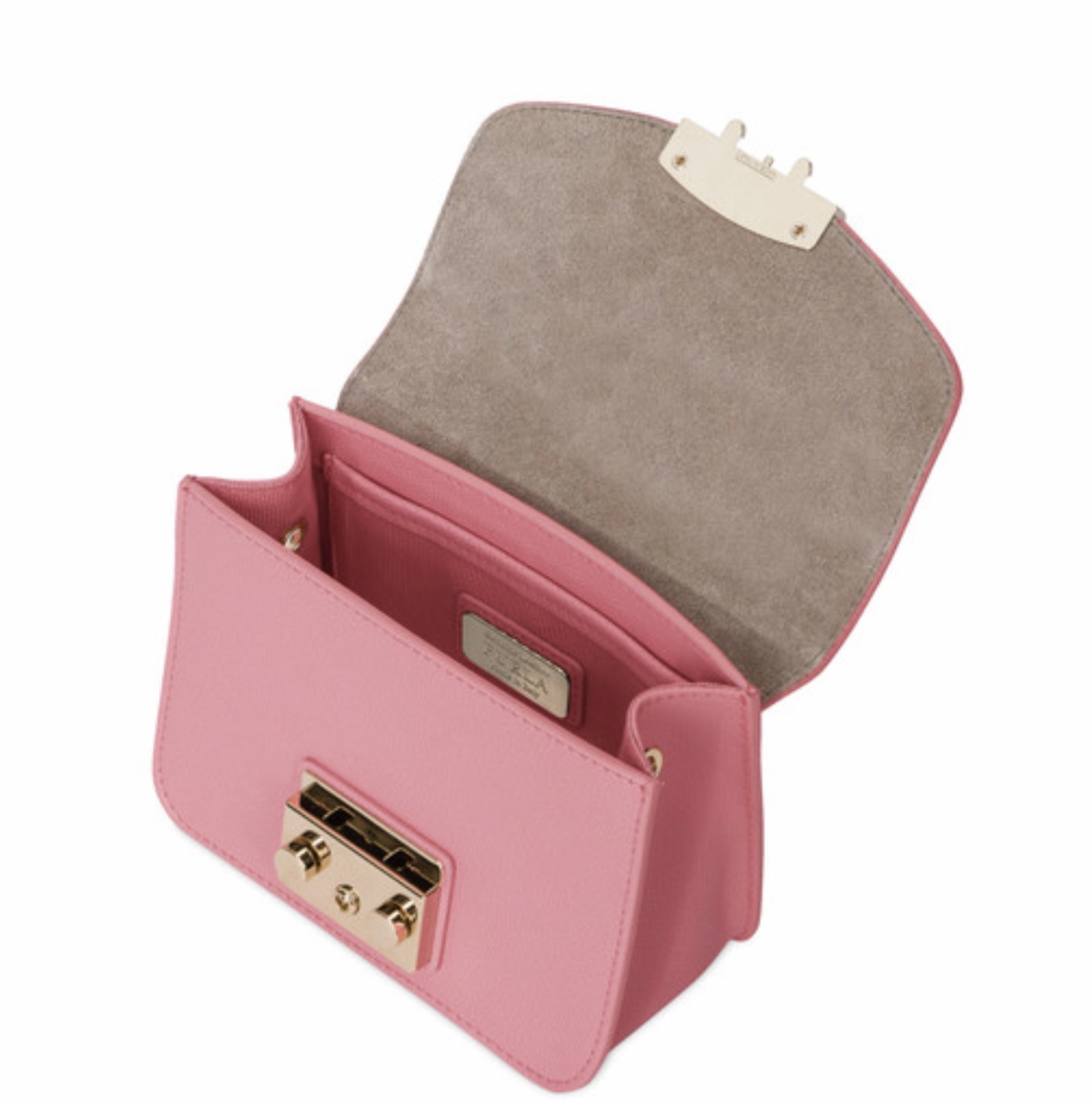 Знаменитая женская мини-сумка Furla Metropolis из тисненой кожи дополнена металлическим замком, который выступает в качестве мгновенно узнаваемого декоративного элемента. Внутри аксессуара имеется практичный открытый карман. Нижнюю часть этой модели надежно защищают металлические ножки. Съемный металлический ремень-цепочка позволяет носить сумку на плече или через плечо.
