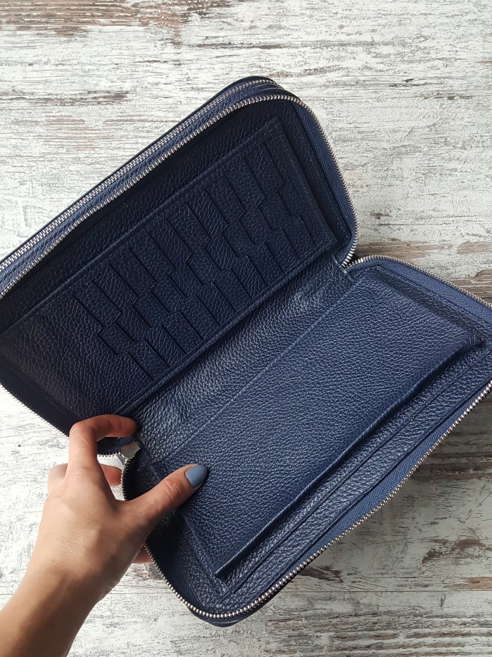 Внутренняя часть клатча изготовлена из буйволиной кожи, и имеет два вместительных отделения документов, наличных денег (евро, доллары, рубли), ключей от автомобиля, смартфонов, кредитных карт и прочего.