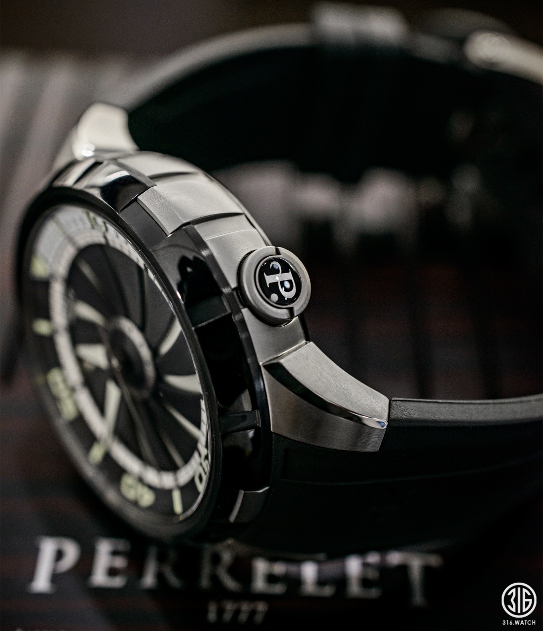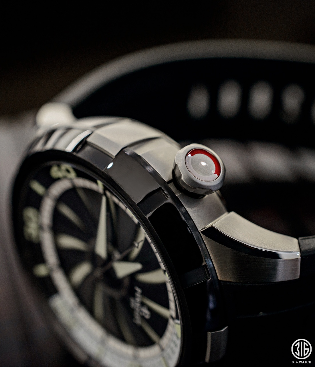 Турбина с серьёзной водозащитой 30 АТМ, износостойким PVD-покрытием и противоударной системой колеса баланса. Часы смотрятся особенно эффектно из-за нижнего люминесцентного циферблата. А через прозрачную заднюю крышку вы можете любоваться фирменным калибром P-331 из 92 деталей.