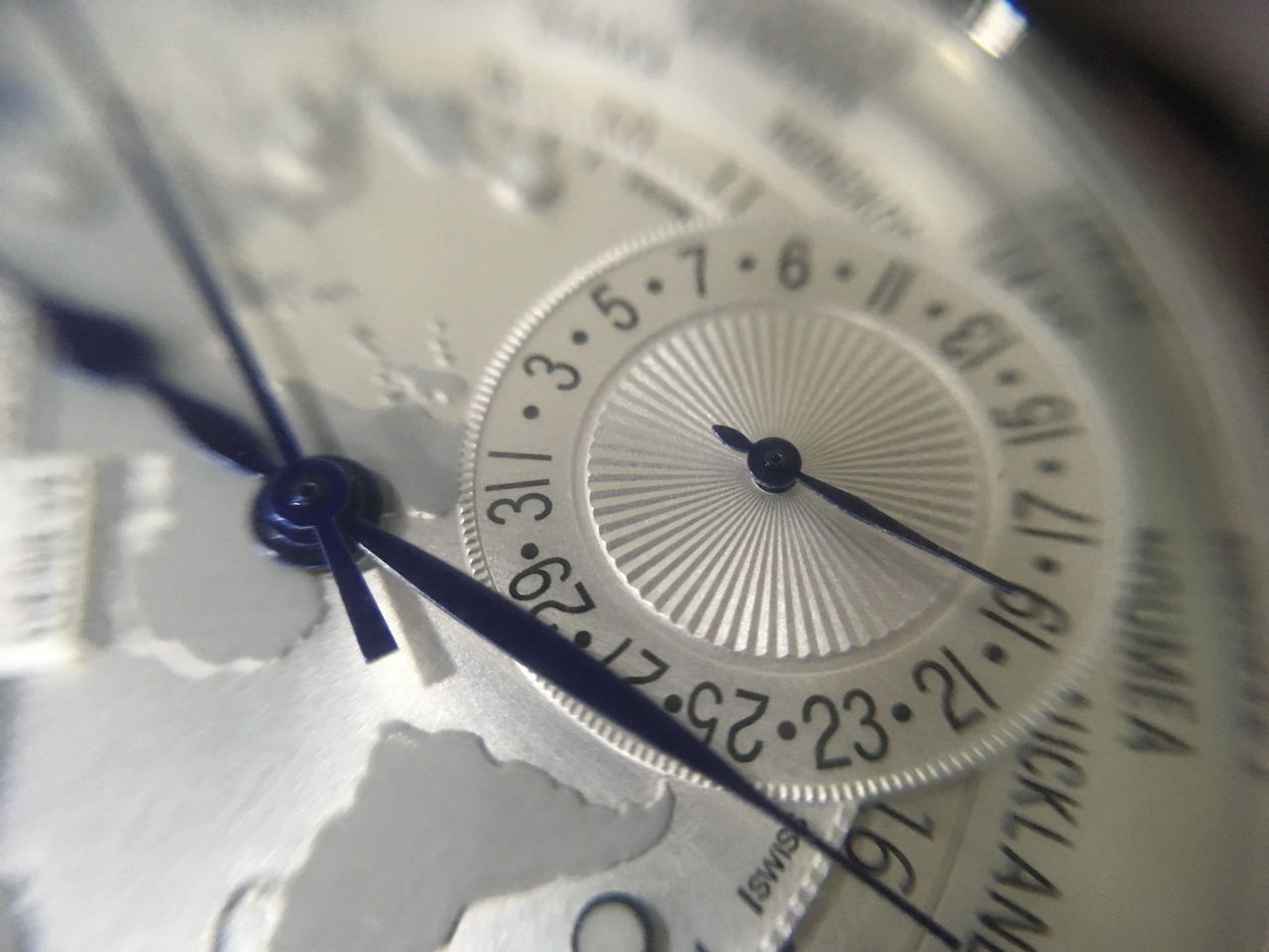 Функции: индикация часов, минут, дата(круглый аналоговый указатель на 6-ти часах), мировое время (внутренняя круглая вращающаяся бело-синяя 24-х часовая шкала с указателем день/ночь, а также названия двадцати четырёх городов на вращающейся шкале по периферии циферблата).