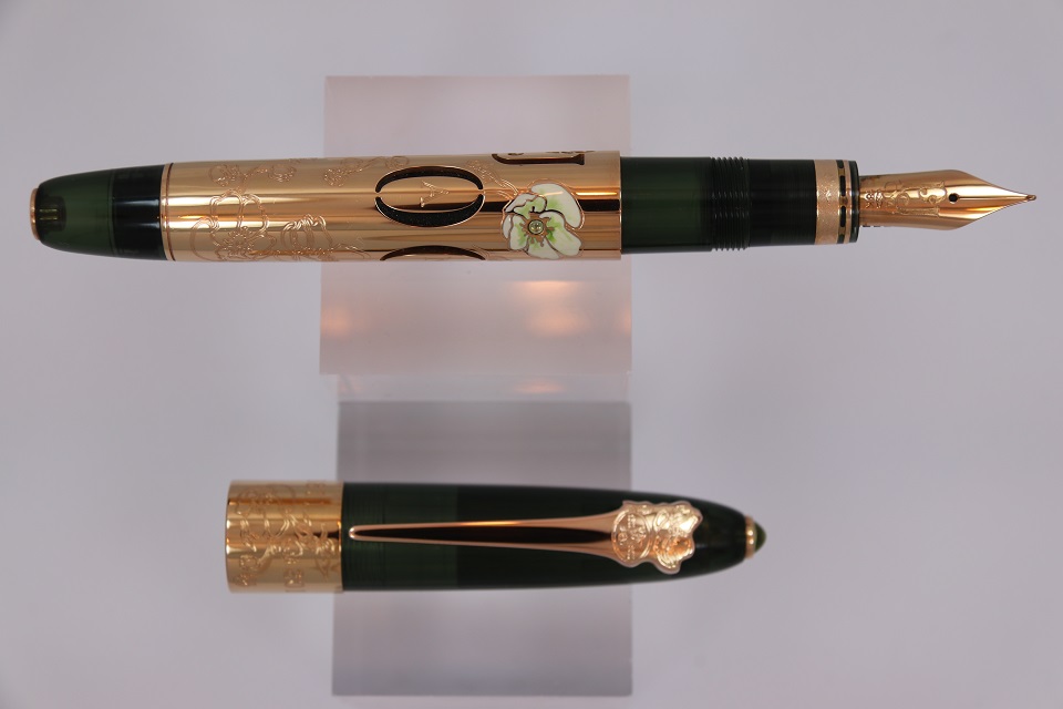 Корпус ручек изготовлен из полупрозрачной зеленой хлопковой смолы, напоминающей цвет бутылок Perrier-Jouet, и декорирован золотой накладкой с выгравированным юбилейным логотипом и цветочным мотивом, свойственным шампанскому Perrier-Jouet. Тот же узор повторяется на клипе ручки, а золотое 18К перо украшают инициалы PJ. Логотип напоминает цветок в стиле ар-нуво с бутылок Perrier-Jouët Cuvée Belle Epoque Champagne.