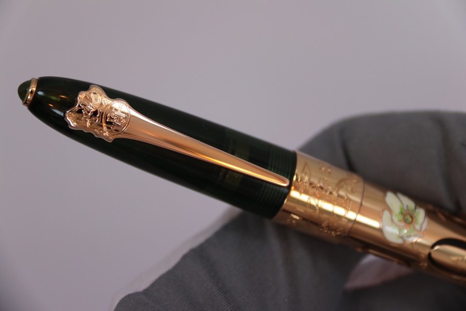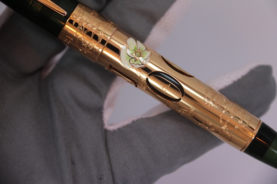 2 светло-зеленых кабошона из перидота, один на вершине колпачка и второй на корпусе ручки.