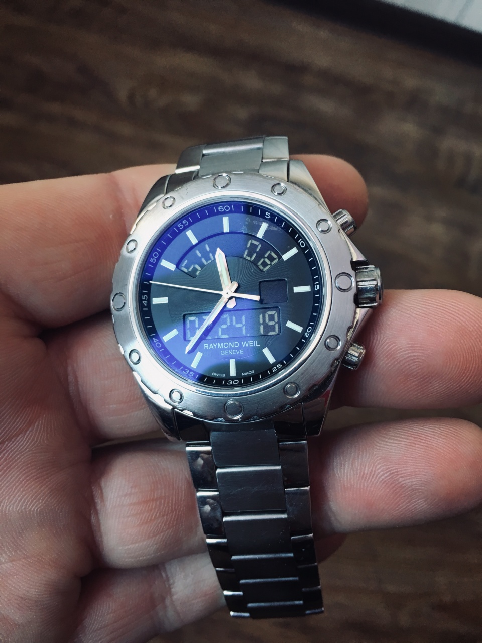Производство: Швейцария Часы носились постоянно(есть потёртости) стекло с синим отливом в идеале!!! Коробка немного помята. На днях сделал репассаж поменял все прокладки и батарейку(чек есть). Браслет полный до 21см. Люм шикарный(впрочем как и сами часы)Почта ваша. Торг в личке! Всем удачи и добра!Всем привет! Последнее снижение цены на часы Raymond Weil 8400-SR1-20001. ТТХ: Механизм: Кварцевый аналоговоцифровой
